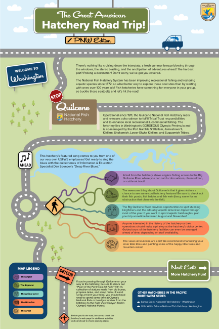A printable companion to the hatchery road trip guide. Full contents of the graphic are available at: fws.gov/story/hatchery-road-trip-quilcene