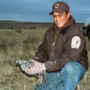 Tribal warden Herman St. Clair releasing a sage grouse hen as part of movement and nesting area study.