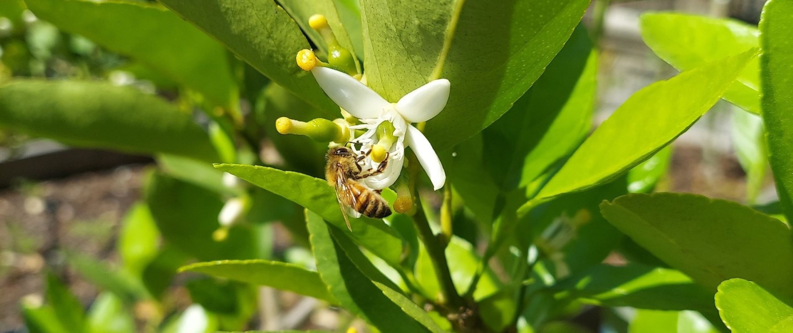 A honeybee perches on a citrus flower in Amber Aguilera's garden. Amber, the Listing and Classification Division Supervisor in the Sacramento FWO, works to make her garden pollinator-friendly by limiting the amount of chemicals she uses, opting instead for nature-based remedies for weed and pest control.