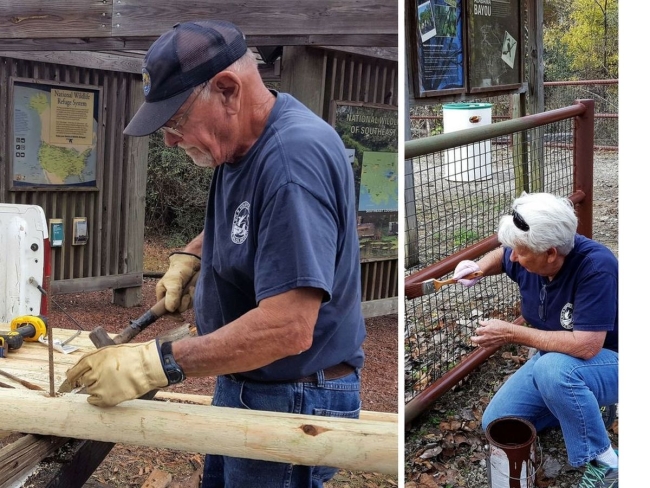Left: Wally Sternberg replaces a rotted landscape timber at Big Branch Marsh National Wildlife Refuge. Right: Carolyn Sternberg primes a fence at Atchafalaya National Wildlife Refuge. Both refuges are part of the Southeast Louisiana National Wildlife Refuges Complex.