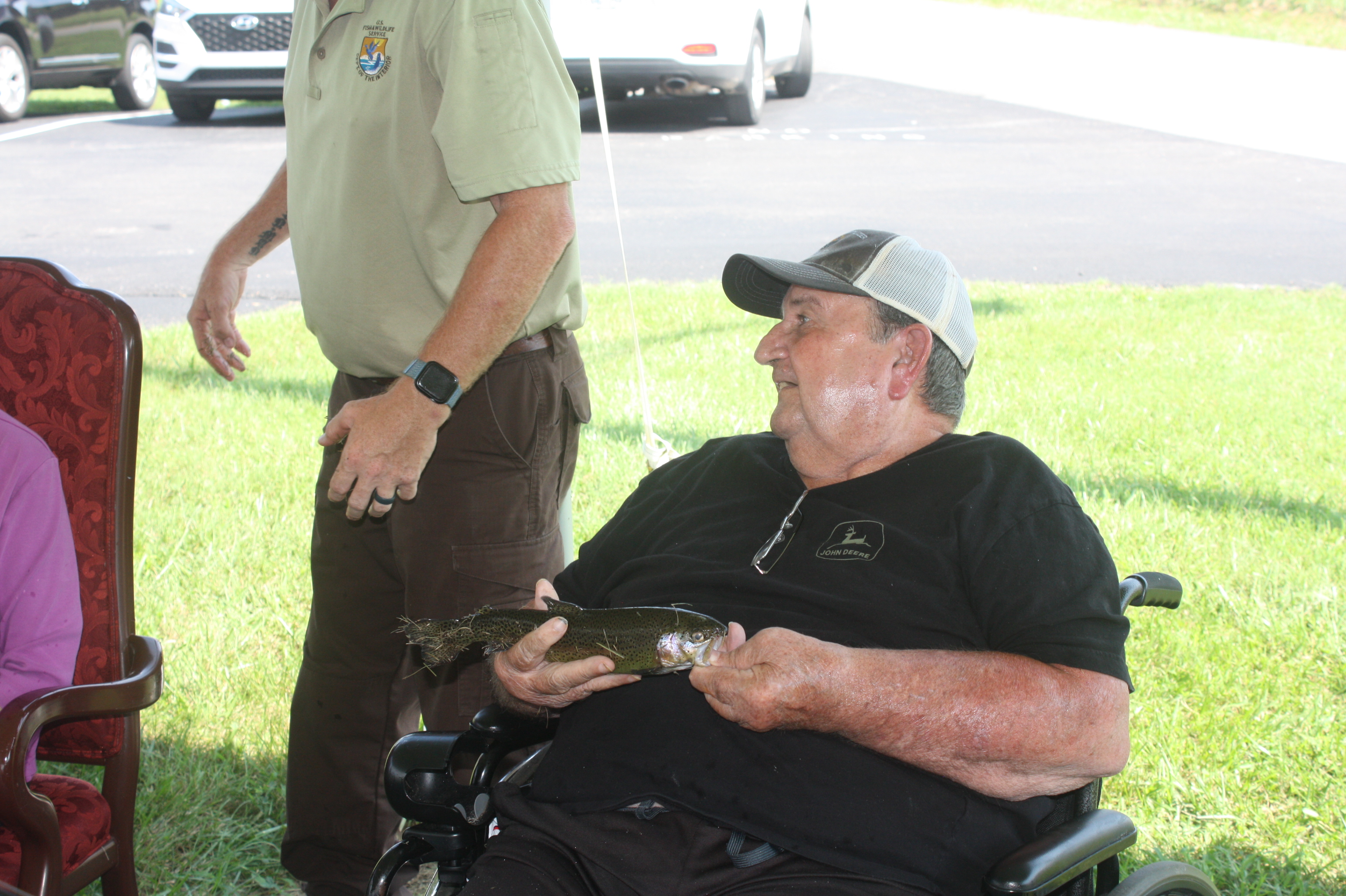 A Fair Oaks Health and Rehabilitation resident holding a Rainbow trout he reeled in at a fishing event provided by Wolf Creek National Fish Hatchery.
