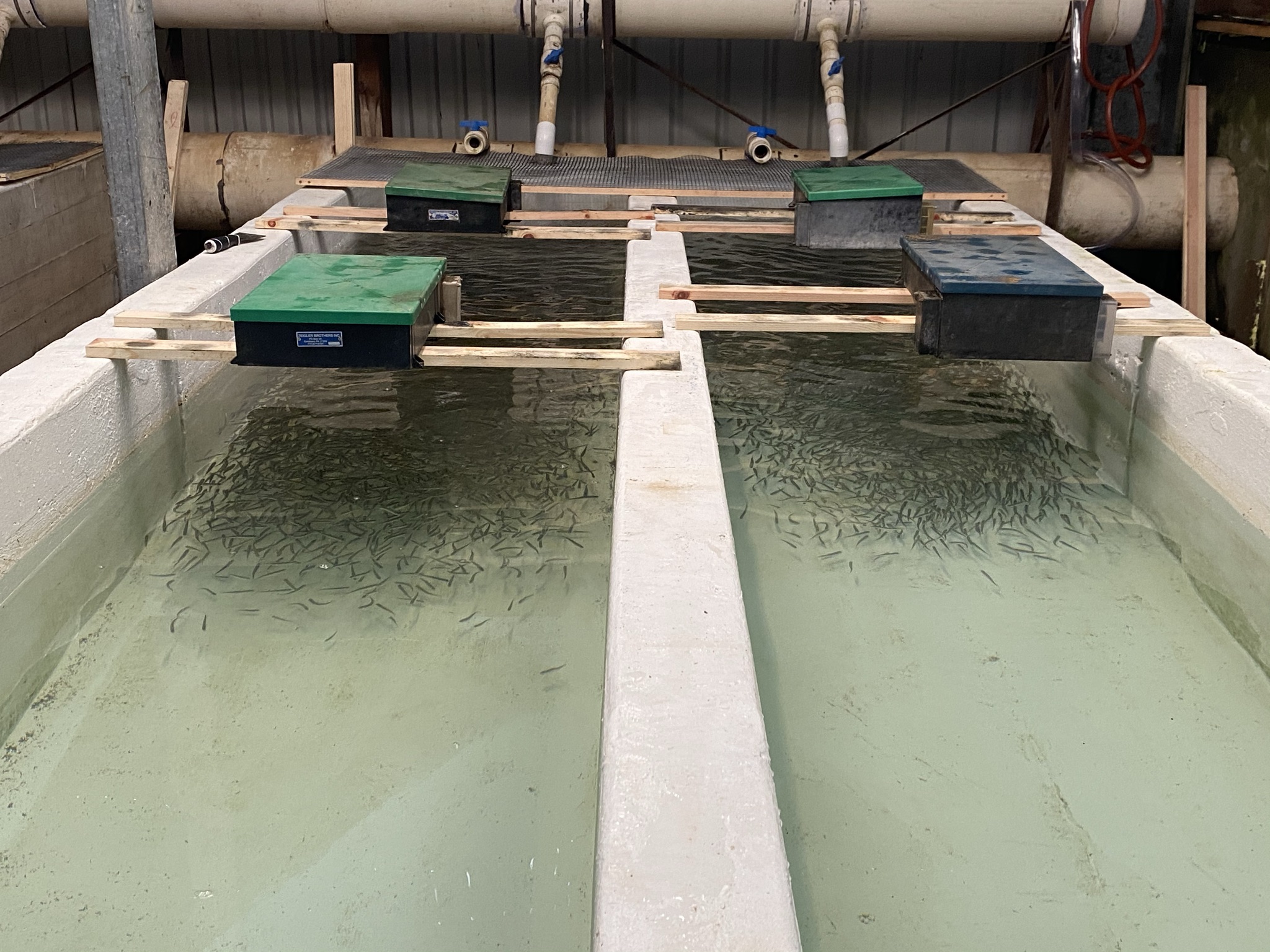 The 40,000 Jumpstart winter-run Chinook are divided into six concrete raceways located indoors at Mt. Lassen Trout Farm. They receive food throughout the day from belt feeders located over each raceway.