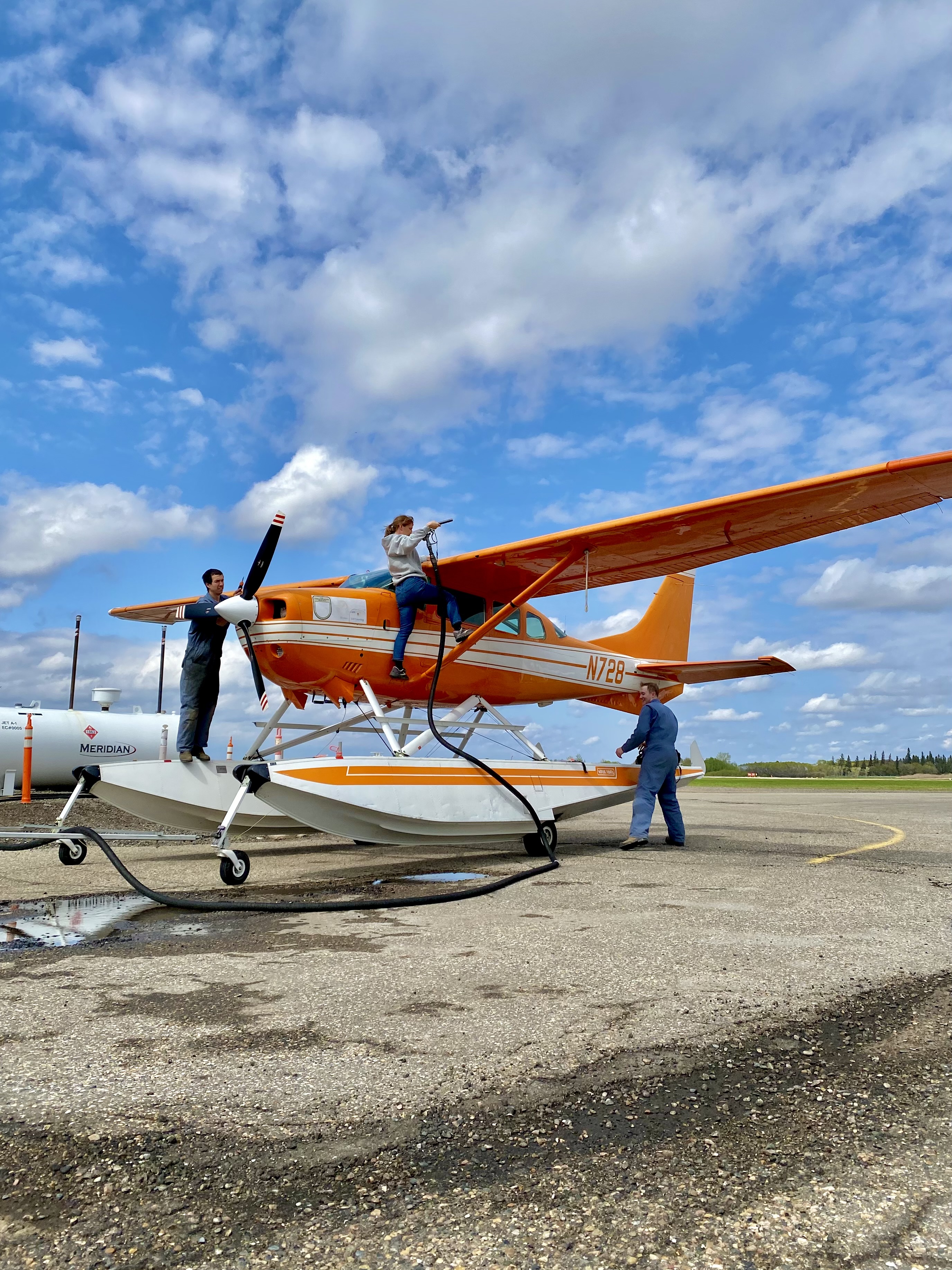 The team inspects the N728 aircraft as part of the safety routine for the 2024 Waterfowl Breeding Population and Habitat Surveys.