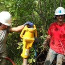 Kate Augustine of Trout Unlimited and Robes Parrish of the Mid-Columbia Fish and Wildlife Conservation Office's Habitat Restoration and Conservation program work together to install a beaver dam analogs at Derby Creek, a tributary to the Wenatchee River.