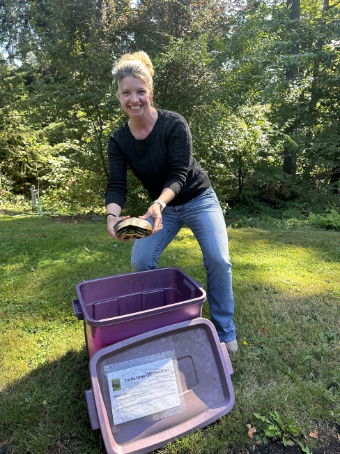 A staff member with the Oregon Department of Fish and Wildlife holds an invasive, red-eared slider (turtle) found during and turned in after a Service-led recreation and aquatic education field trip on Oregon's Clackamas River. Red-eared sliders are invasive to Oregon's waterways, and if found in the state of Oregon ODFW should be contacted at 1-866-INVADER.