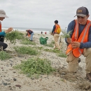 Nature Collective volunteer Beverly Patterson and intern Issac Vallejo remove invasive sea rocket from newly created dunes at the Living Shoreline Project in Encinitas, California.