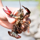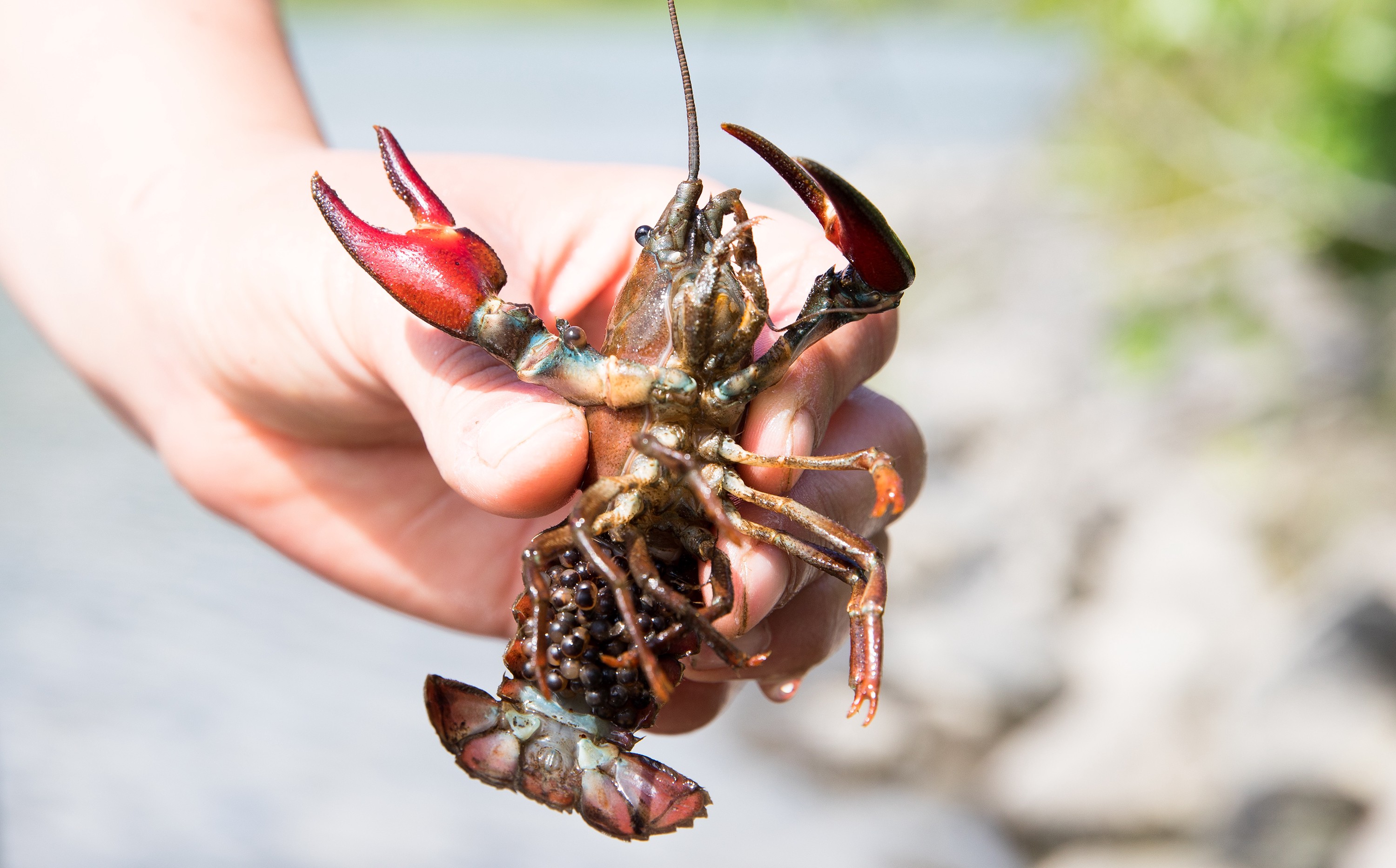 A gravid female signal crayfish from Kodiak National Wildlife Refuge’s Buskin River waves her claws. Note the distinctive white patches (signal) at the claw joint.