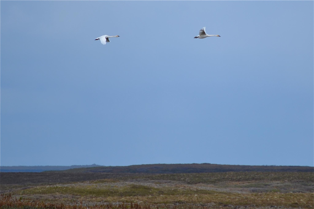 Two tundra swans fly over Izembek National Wildlife Refuge.