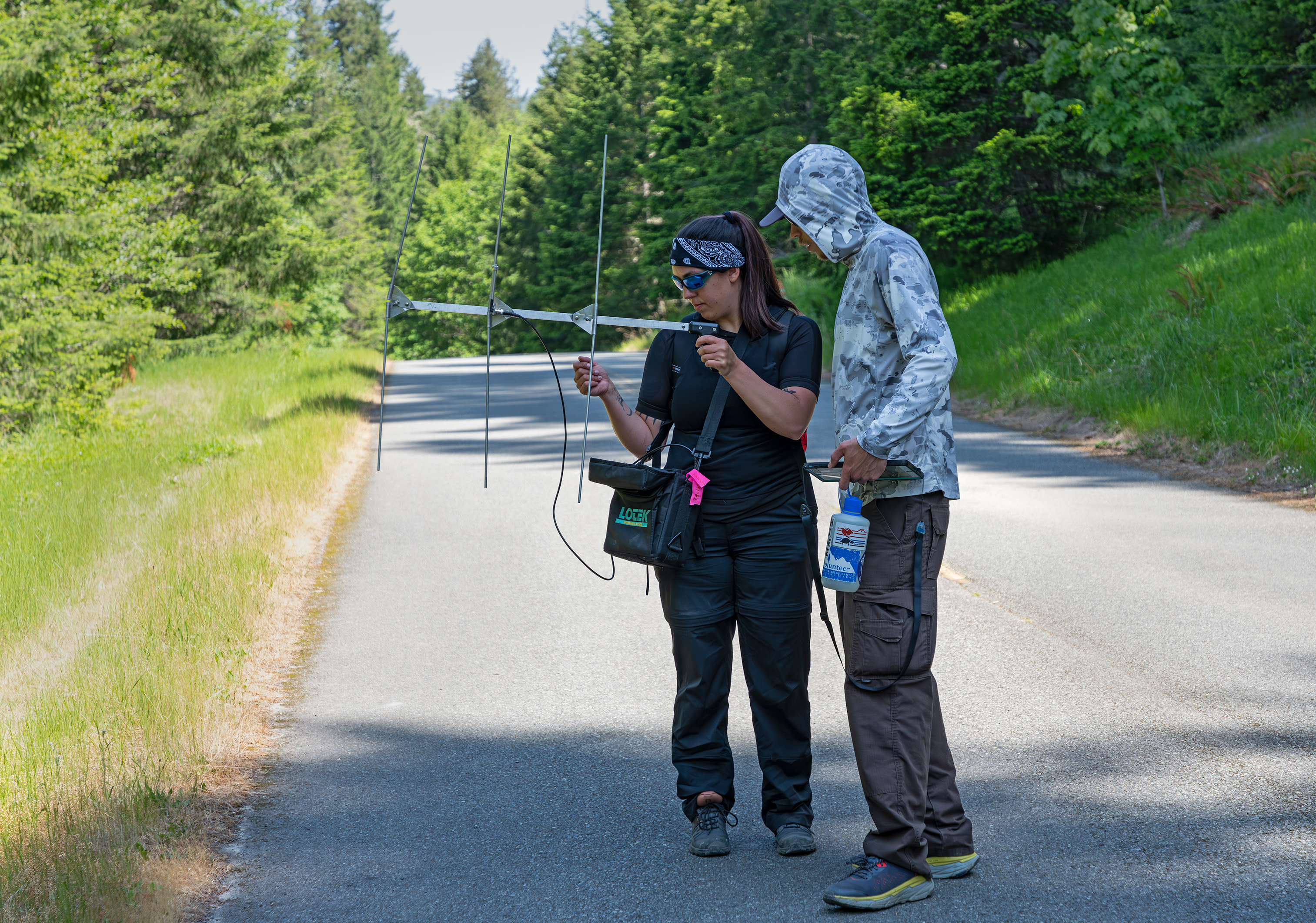 Bengelink training intern, Bethany Fackrell, radio tracking protocol near the Elwha River in Port Angeles, Washington.