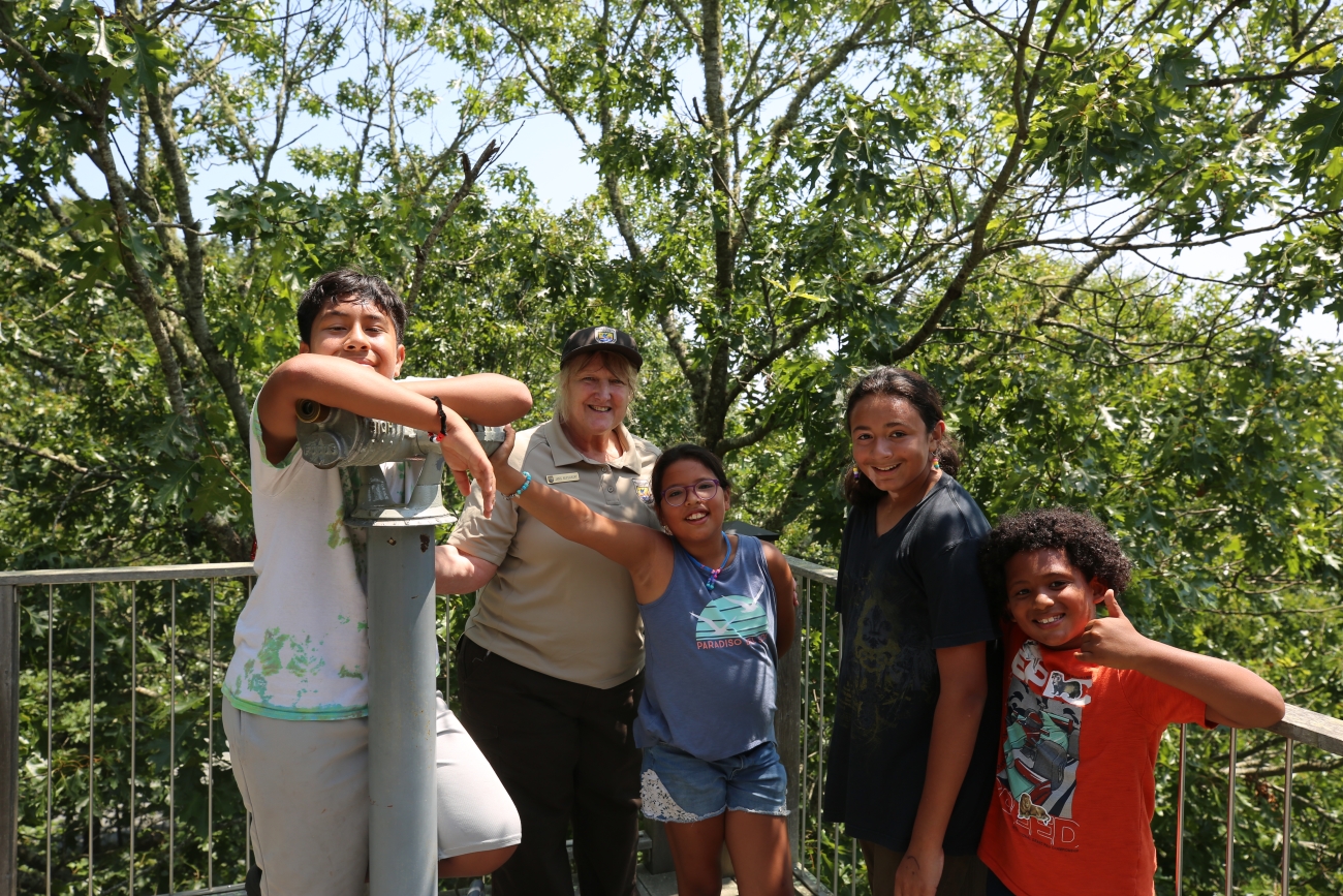 Rhode Island National Wildlife Refuge Complex Visitor Services Manager Janis Nepshinsky with campers from Mystic Aquarium's Indigenous Youth Summer camp.