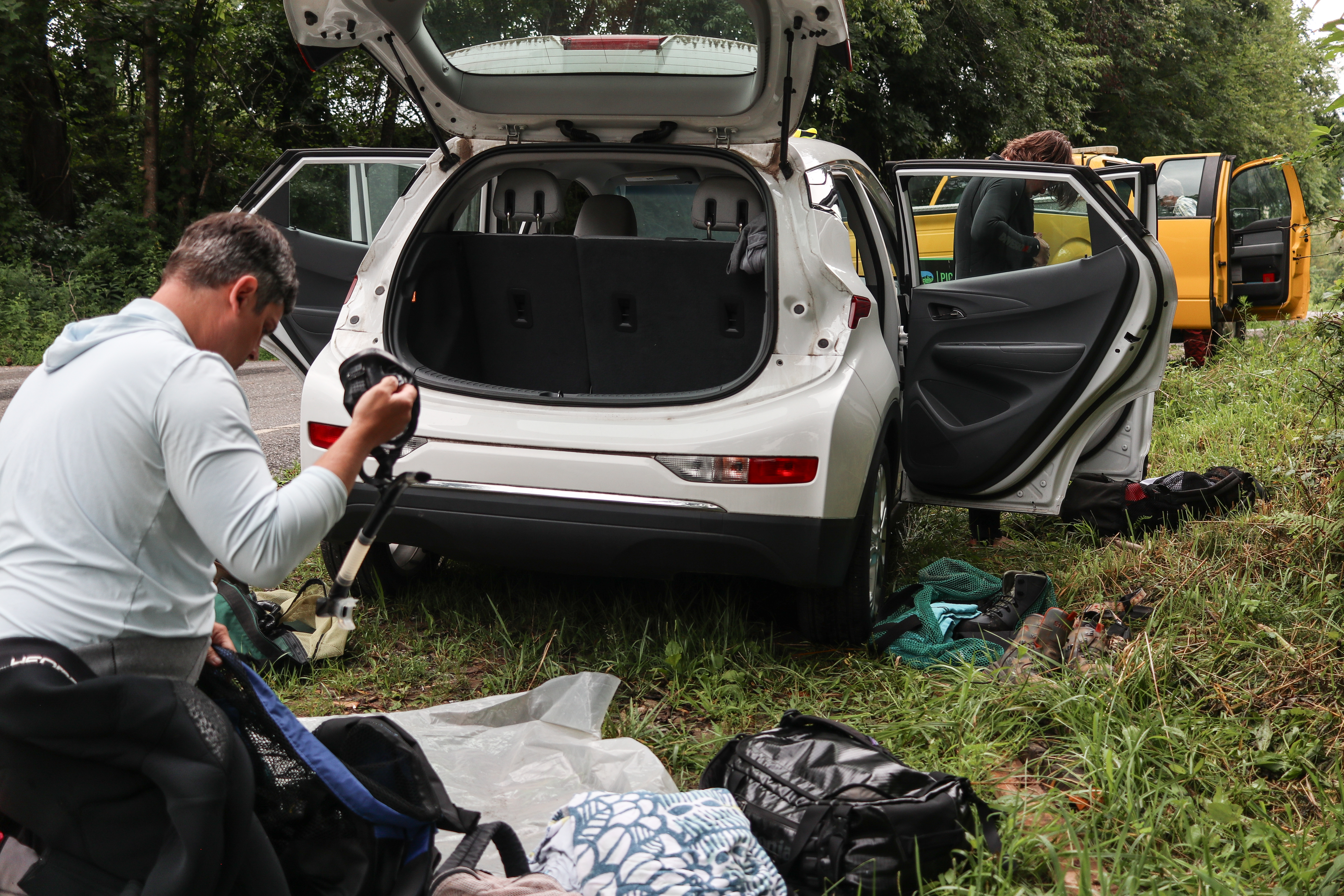 Jay Mays and Byron Hamstead, USFWS, prepare to snorkel for mussels in the East Fork of the Pigeon River, Haywood County, NC.