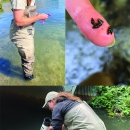 Columbia River FWCO biologist, Jennifer Poirer surveying for New Zealand Mud Snails. Top left- is Jennifer taking water quality samples at Deschutes River. Top right - multiple New Zealand Mud Snails shown on her fingertip. Bottom - Jennifer doing a visual survey for New Zealand Mud Snails using the aqua scope.