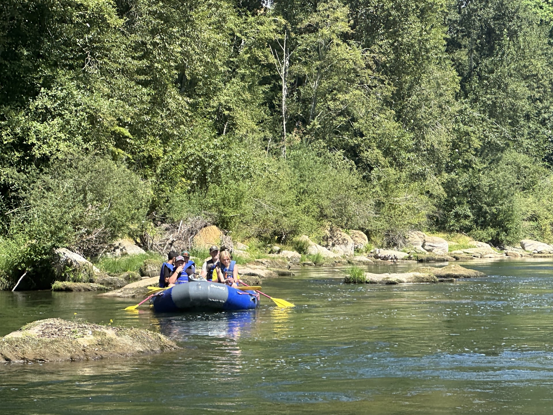 Jeremiah Civil piloting a raft with young students from Springwater Environmental Science school down the Clackamas River to look at restoration projects and teach about the impacts to aquatic life.