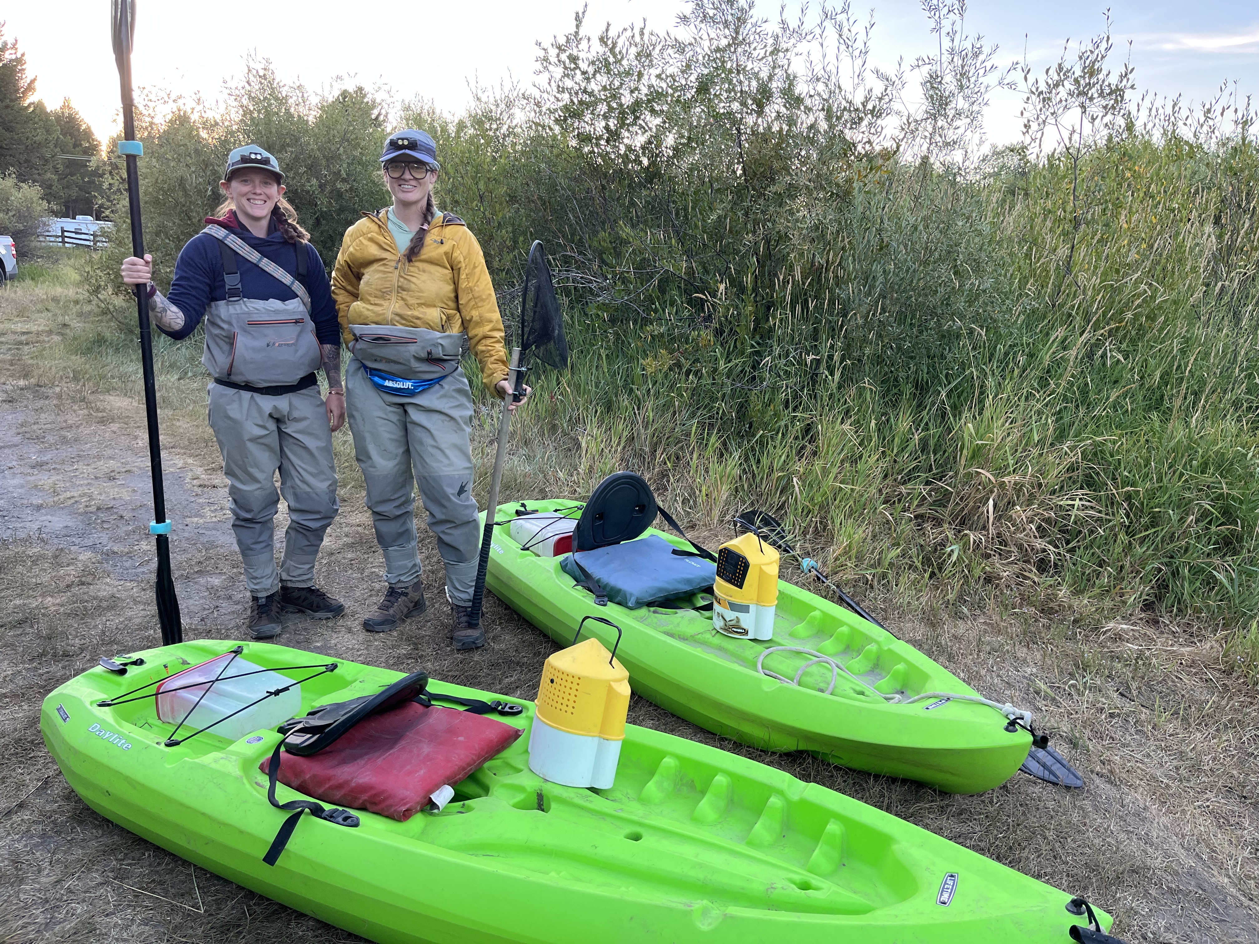 Two members of Wilmoth’s 2023 bullfrog removal team, Hayley Crosby (left) and Katie Sauerbrey (right), suit up at sunset and get ready to go bullfrogging — looking to capture adult bullfrogs via kayak.