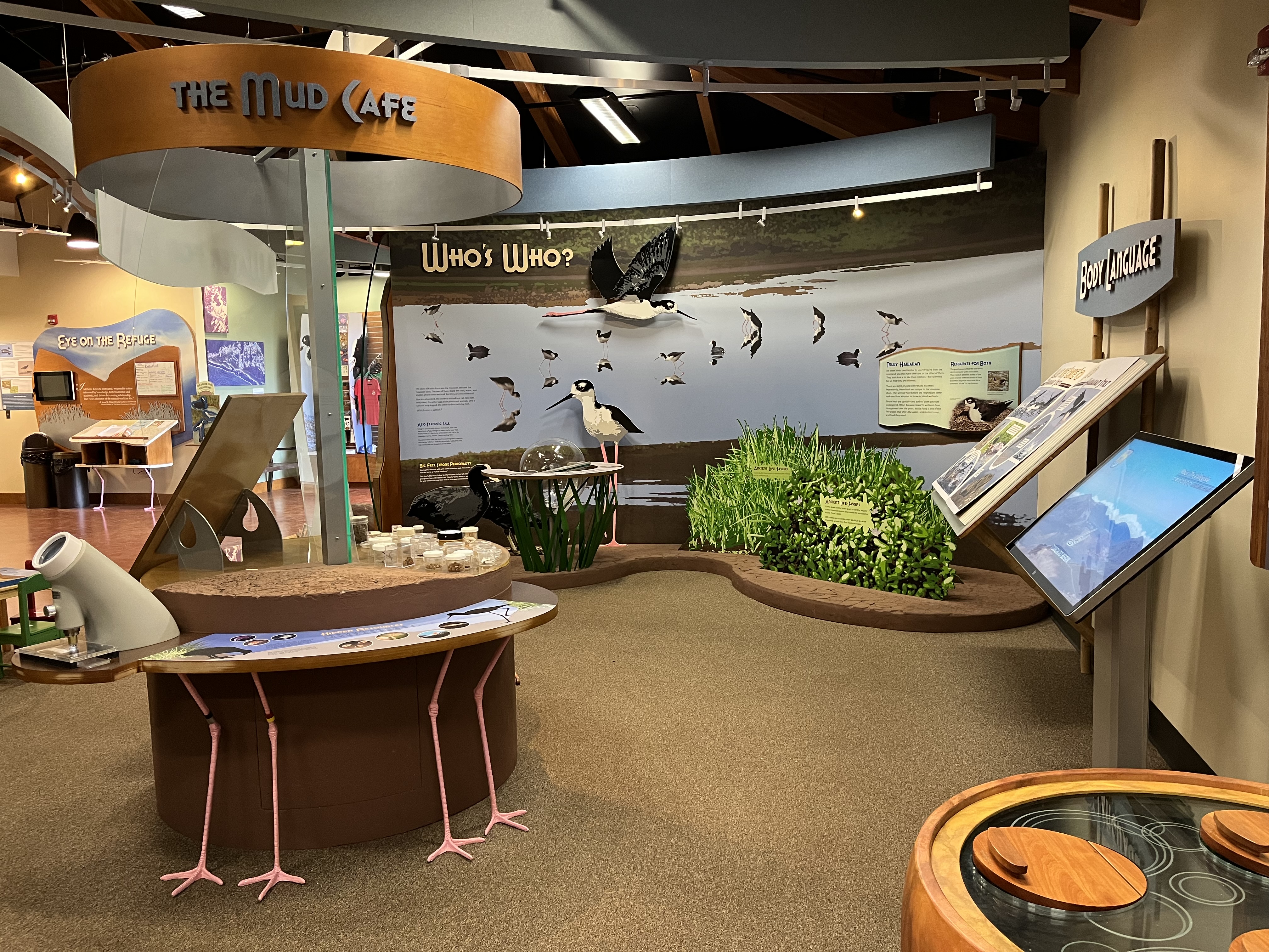 The Keālia Pond National Wildlife Refuge visitor center exhibit hall offers learning stations where people can learn about the wetland and the species that live there.