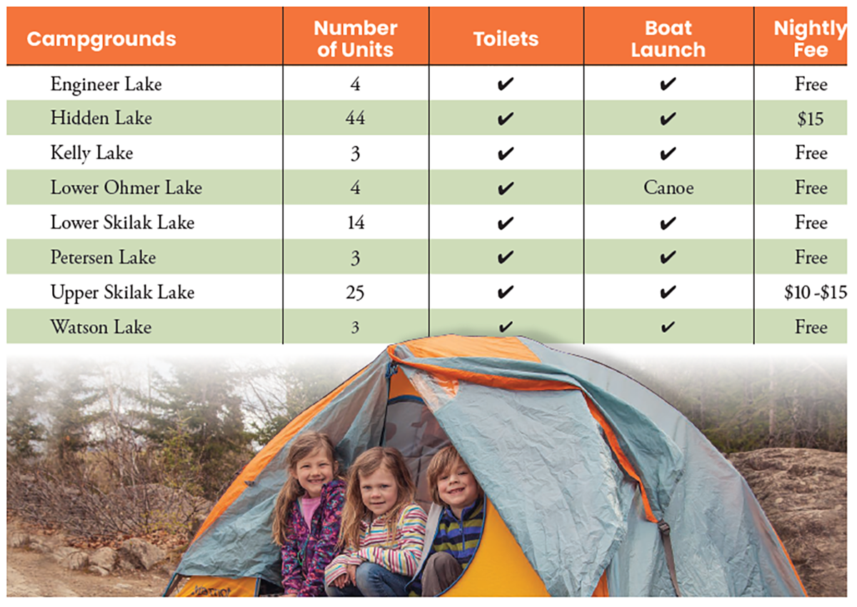 Kenai NWR Campground information with campground name, number of units, toilets, boat launch, and nightly fees.