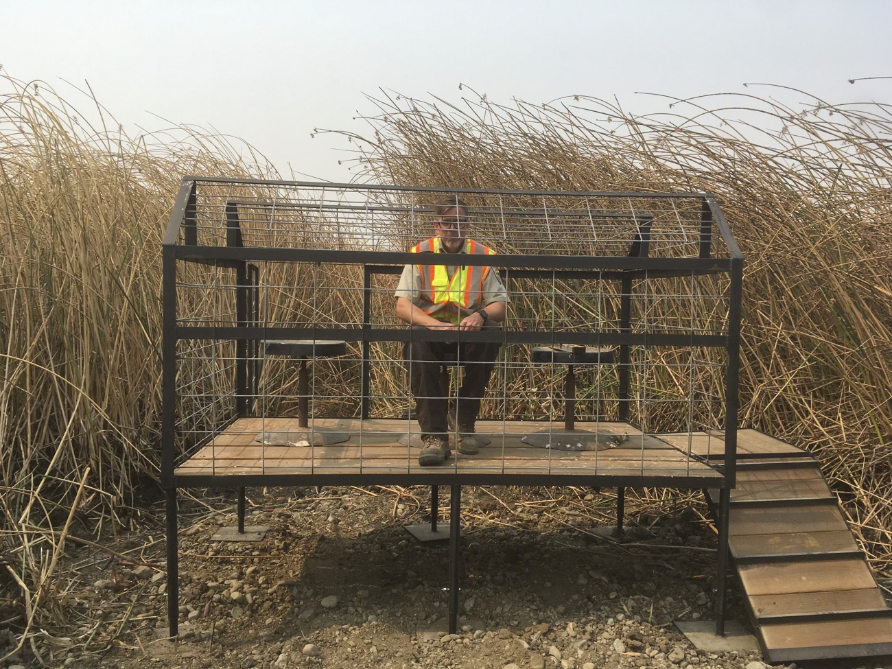 Engineering Equipment Operator Brandon Jordan testing out one of the new hunting blinds at San Luis National Wildlife Refuge. Credit: USFWS