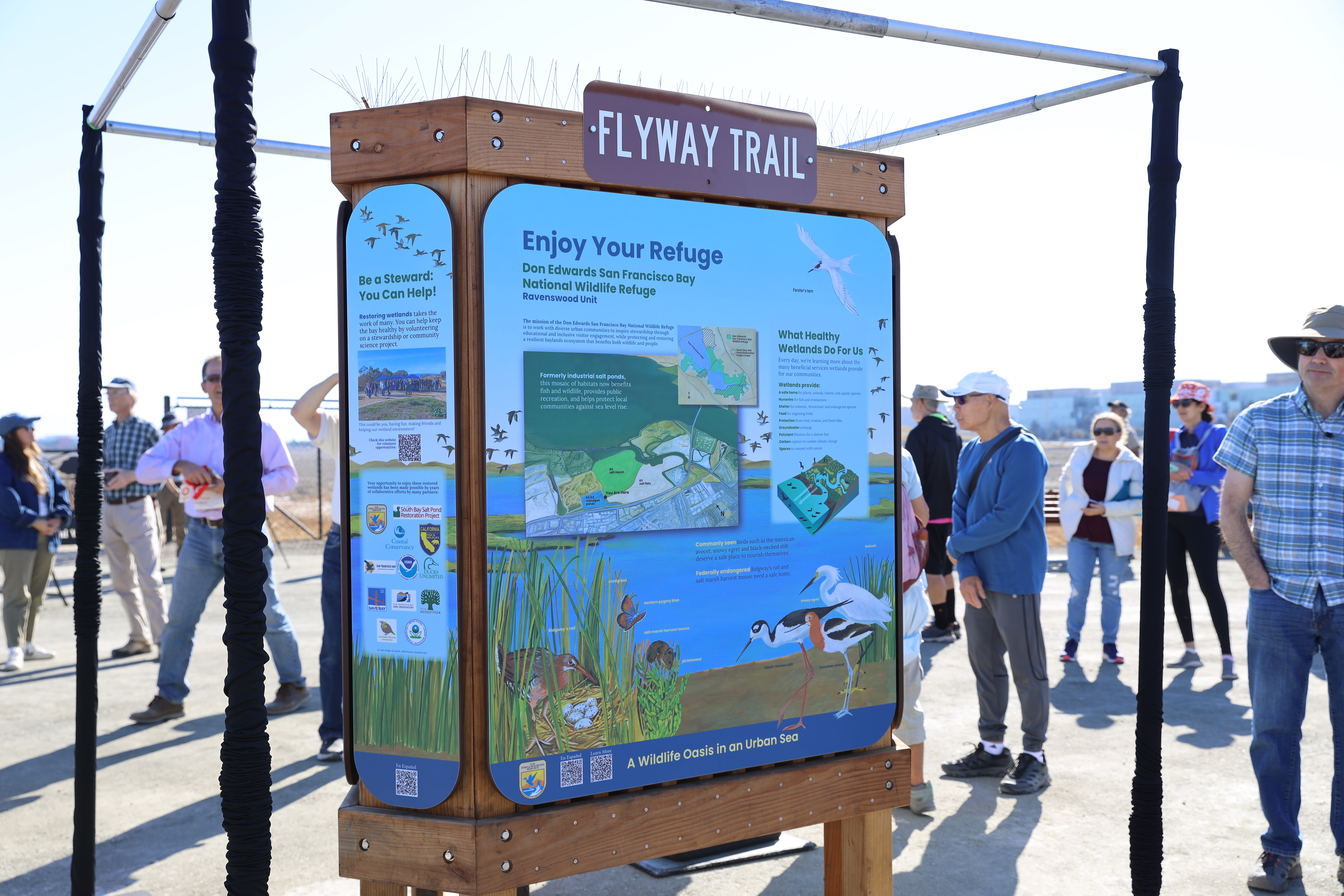 Visitors look at a kiosk on the Flyway Trail at Don Edwards San Francisco Bay National Wildlife Refuge on the trail's opening day in October 2024.