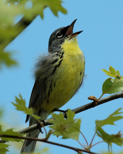 A male Kirtland's warbler sings from a tree branch.