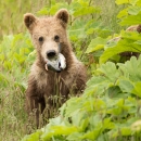 A brown bear cub holds a fish head in its mouth at Kodiak National Wildlife Refuge in Alaska. Fish brains are a dense source of energy for bears.