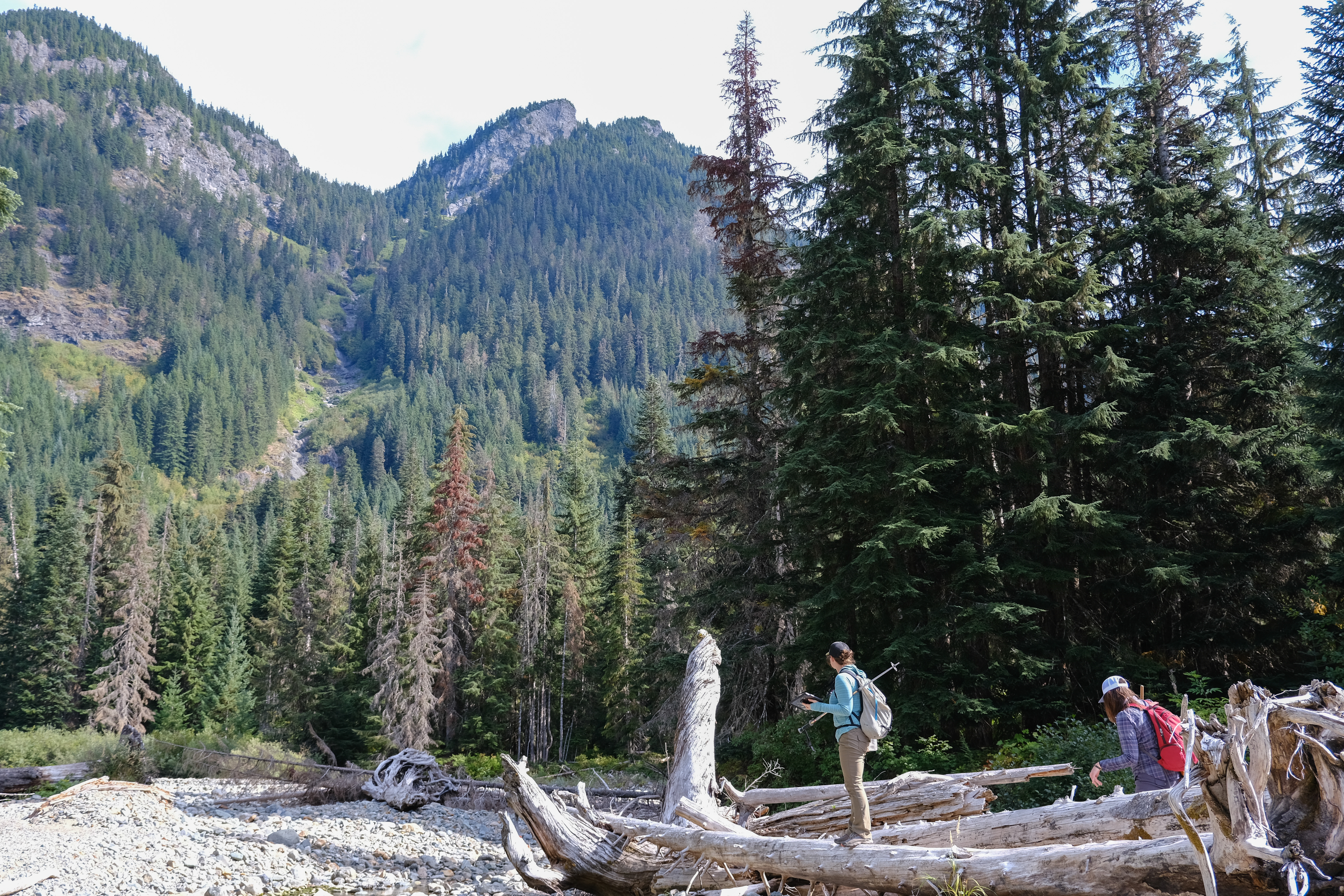 Biologists Katy Pfannenstein and Amy Horstman conduct a large wood survey in Gold Creek, Washington. Logjams are an essential part of restoration of this habitat; over 140 will be installed instream to stabilize the streambanks, narrow the stream width, improve floodplain connectivity, and increase the diversity of fish habitat. Performing pre- and post- implementation monitoring of logjams will help us evaluate the effectiveness of the restoration project.