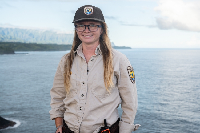 Laurel Smith, smiling in uniform, at Kīlauea Point National Wildlife Refuge in Hawaii. Photo Credit: Angela Iwai-Pineda