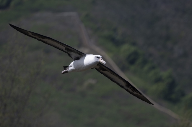 A Laysan albatross (mōlī) soars over a section of predator exclusion fence on Nihokū at Kīlauea Point National Refuge. Nihokū and Mokolea Point are ideal nesting locations for seabirds because the hills and plateaus within this portion of the refuge rest on the northern coastline where seabirds like this Laysan albatross can easily land and take off.