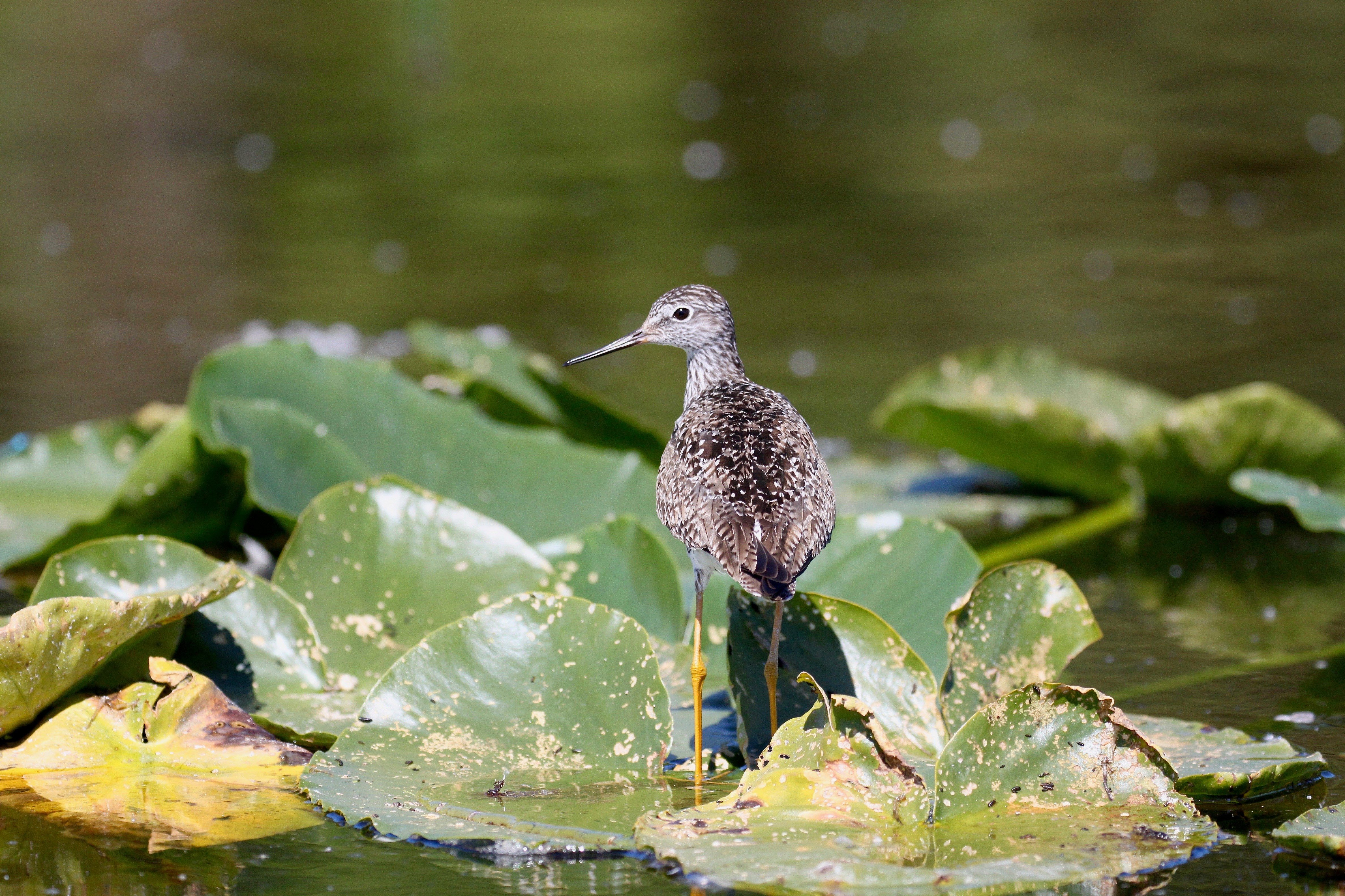 A Lesser Yellowlegs stands on a lily pad in Anchorage, Alaska.