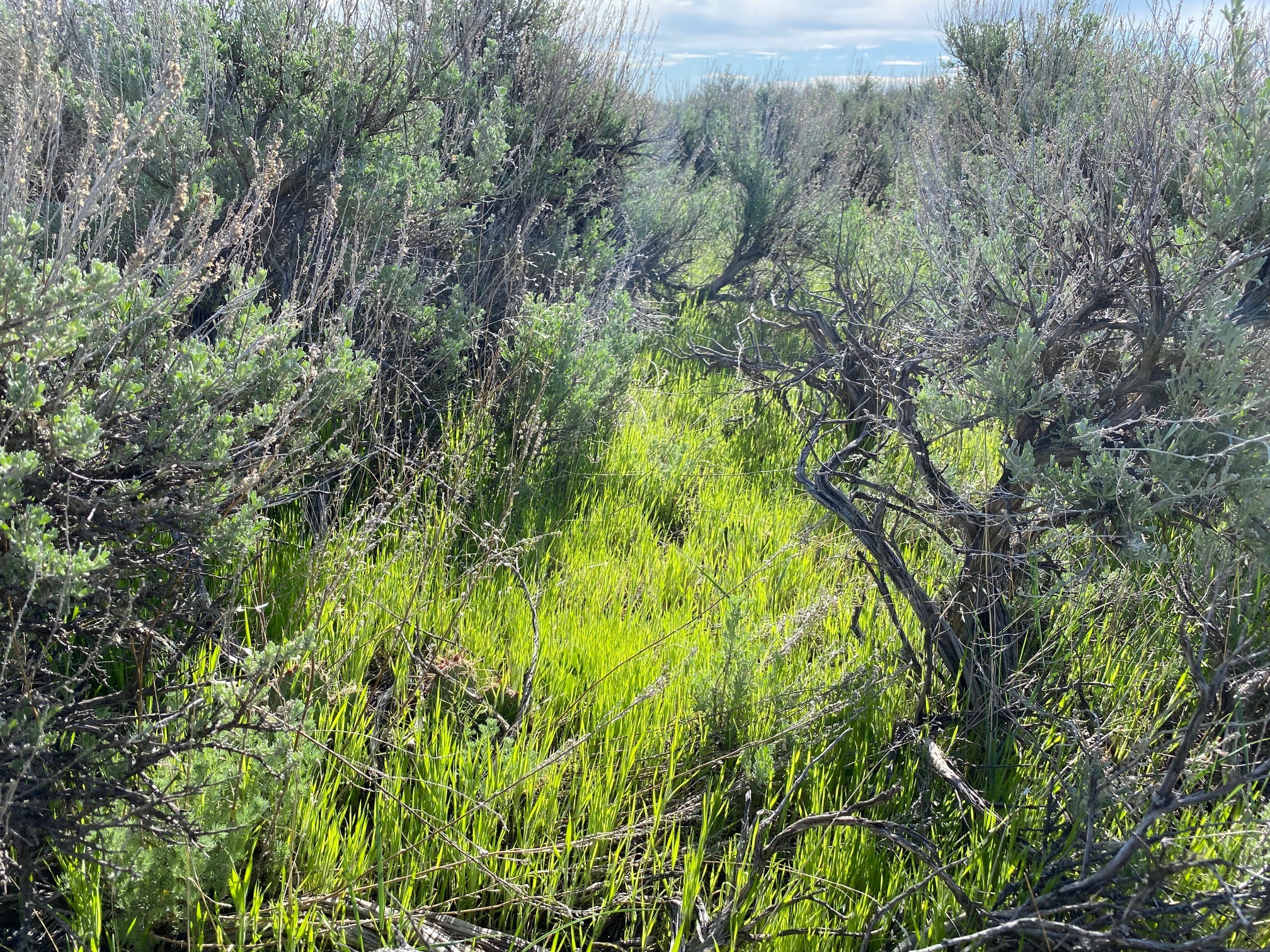 Light green Japanese brome, an invasive annual grass, surrounding sagebrush plants at the Charles M. Russell National Wildlife Refuge Complex