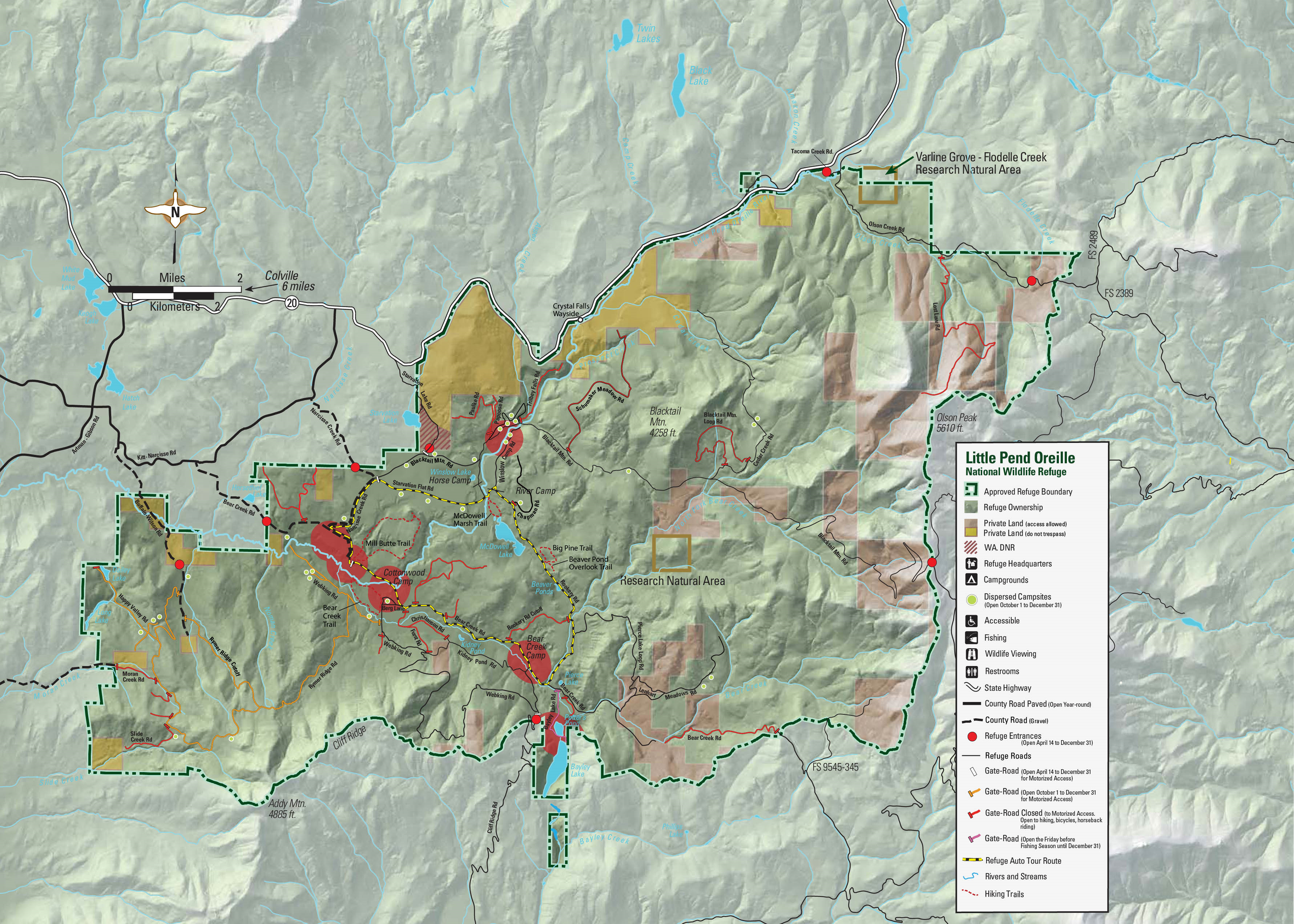Little Pend Oreille National Wildlife Refuge hunting map shows the approved refuge boundaries, and identifies private land and Washington Department of Natural Resource land within the approved refuge boundary. The Refuge is located 6 miles east of Coville. The refuge is covered in labeled bodies of water, including McDowell Lake and Bayley Lake within the Refuge boundaries. The map identifies dispersed campsites, refuge entrances, refuge headquarters, restrooms, hiking trails, fishing locations, wildlife viewing areas, established campgrounds, county roads and gate roads with their respective open seasons. There is a Refuge Auto Tour route that goes in a loop around the interior of the Refuge. For more information, please contact (509) 684-8384 or visit www.fws.gov/refuge/little-pend-oreille.