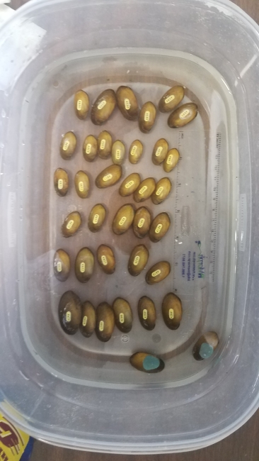 Louisiana Pearlshell mussels with freshly glued, yellow, Hallprint or PIT tags. Pit tags are covered sealed with gray marine epoxy to increase retention. These tags provide a unique identification for each individual, each presenting an different advantage. HallPrint tags are labeled directly on the shell and can be easily read while PIT tags need a special reader but can be detected without seeing or handling the mussel.