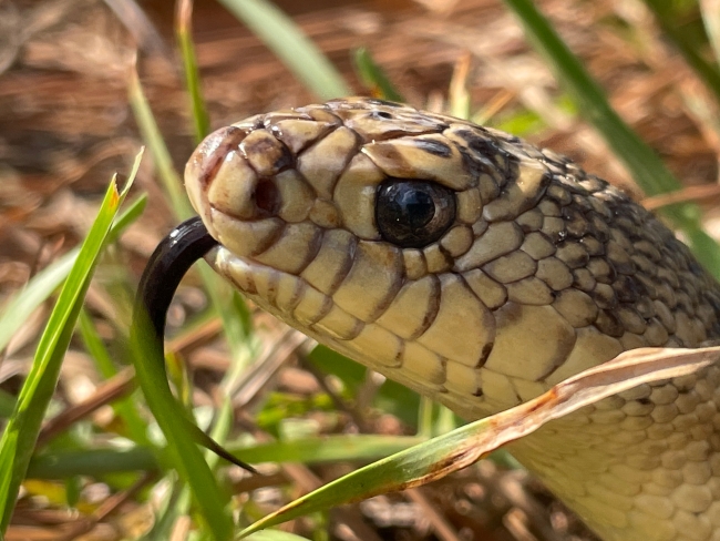 Mr. Snake, a Louisiana pinesnake that helps the U.S. Forest Service with education and outreach, smells with his tongue July 11, 2022. The Service listed the Louisiana pinesnake as threatened under the Endangered Species Act on April 6, 2018.
