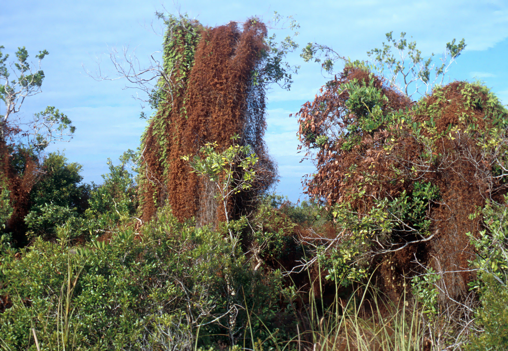 Old world climbing fern (Lygodium microphyllum) after treatment at Arthur R. Marshall Loxahatchee National Wildlife Refuge. Old World climbing fern can grow horizontally or vertically and reach heights of over 60 feet into tree canopies. This non-native fern threatens sensitive habitats of the Everglades by growing up and over native trees and shrubs, reducing plant diversity and degrading habitats. It is capable of covering large areas, including entire tree islands.