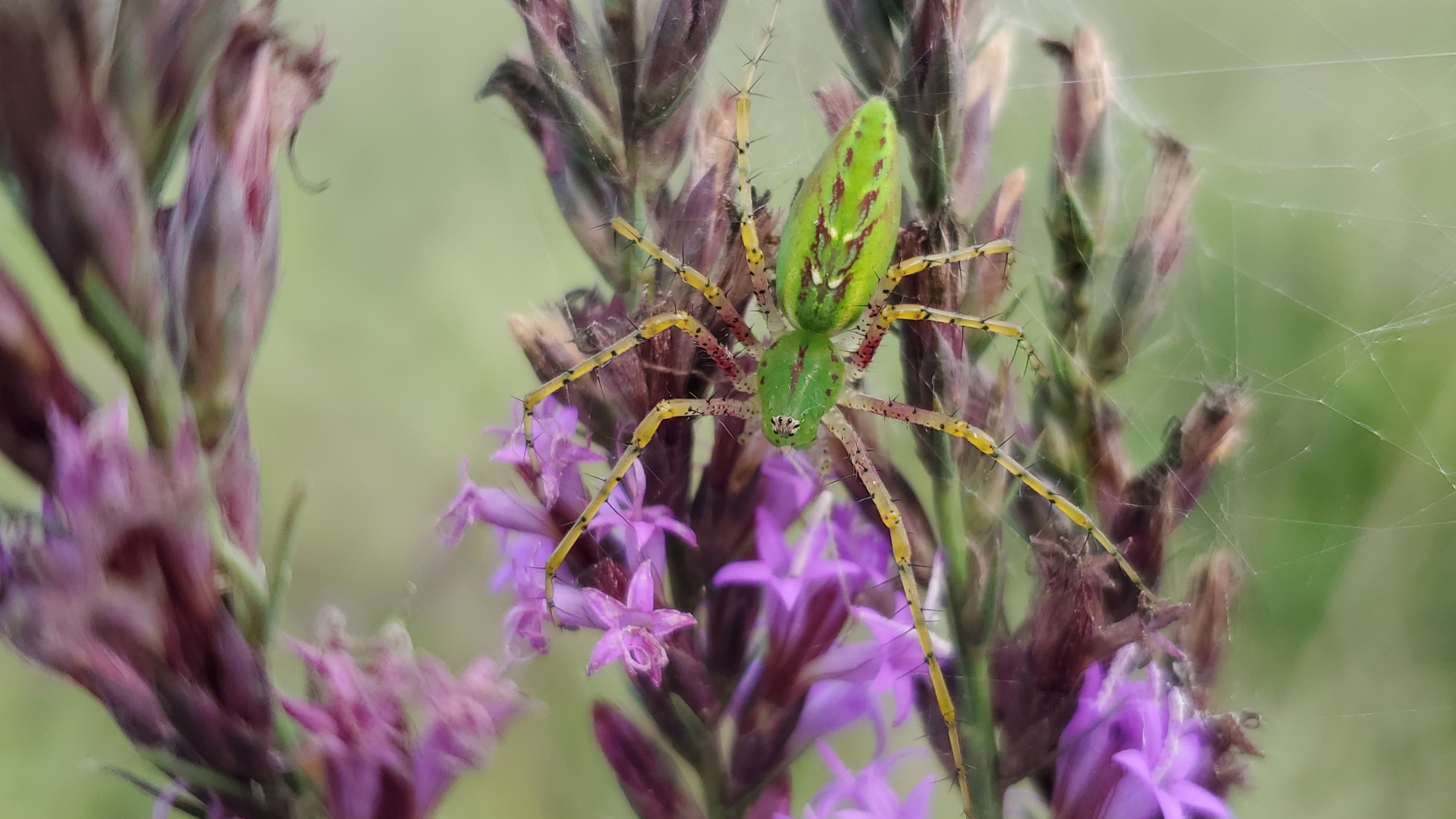 The green lynx spider is perched atop the stalks of a blazing star plant.