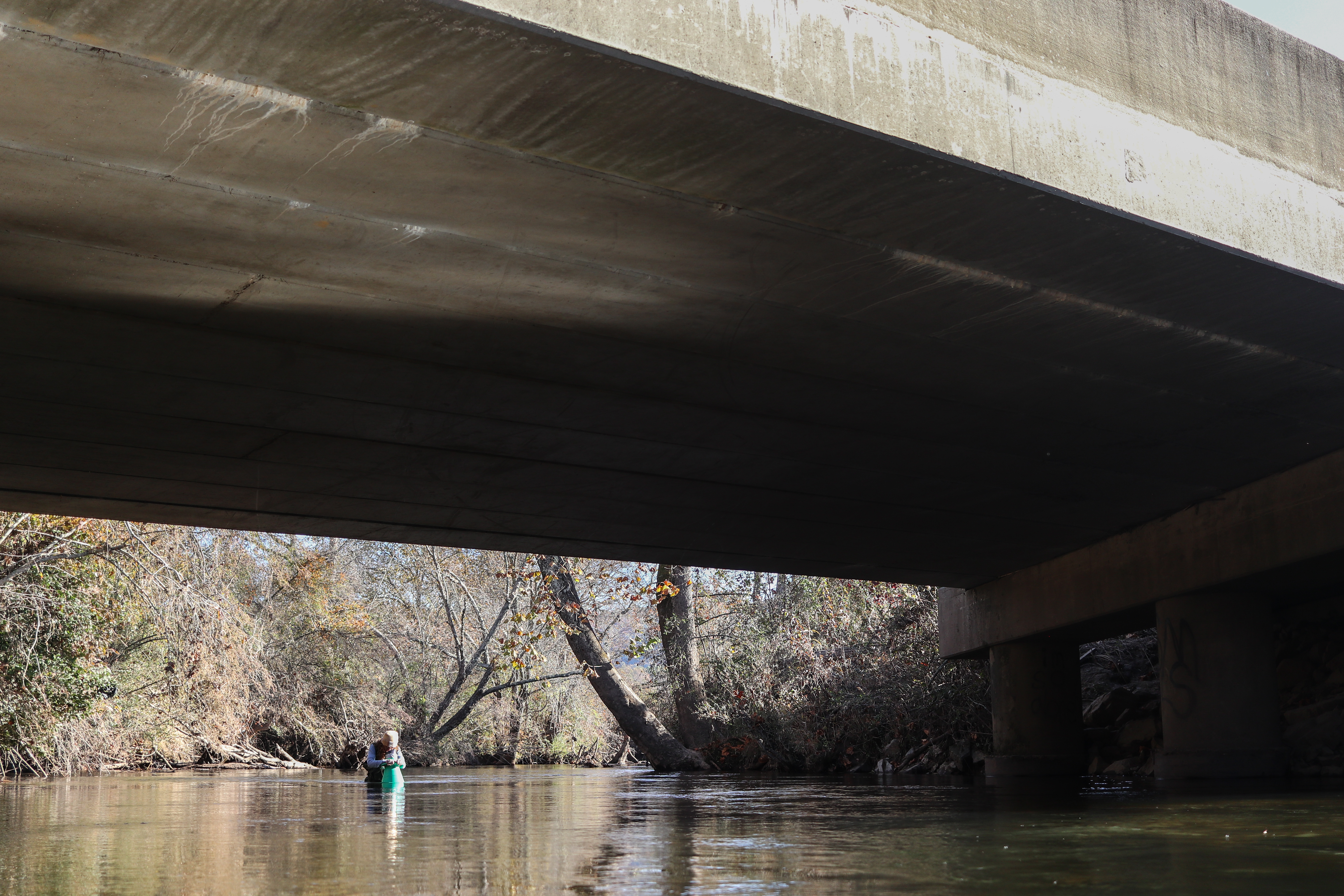 Madison Polera, US Fish and Wildlife Service, searches for mussels in the Little River, Transylvania County, NC.