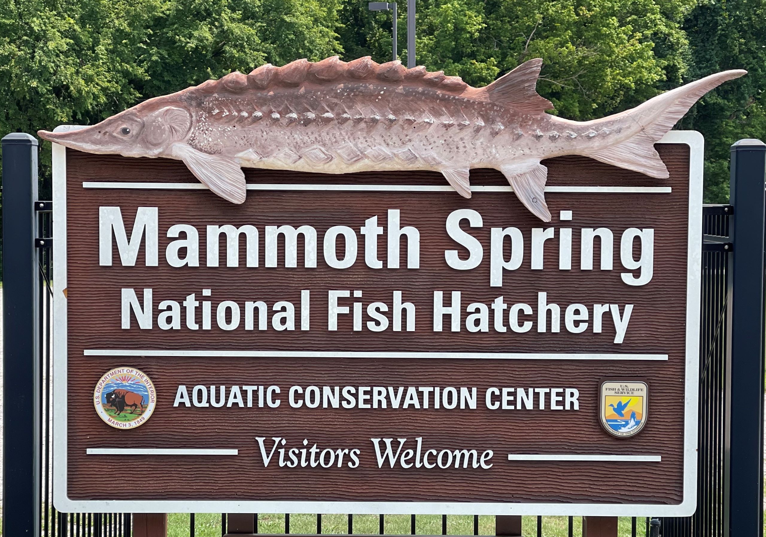 Mammoth Spring National Fish Hatchery welcome sign with a carved sturgeon on top and logos for the Department of the interior and US Fish and Wildlife Service