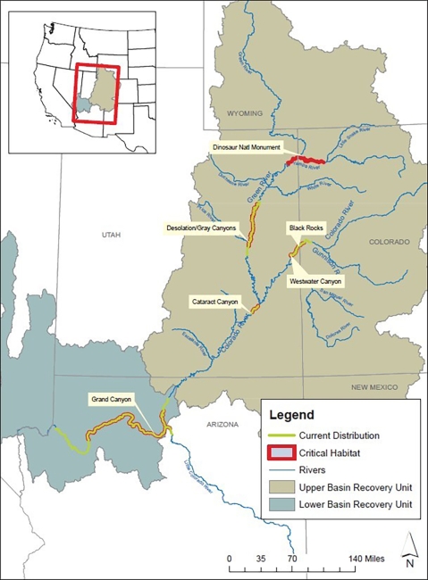 Map of Humpback chub occupied range and critical habitat. Credit: Julie Stahli, USFWS