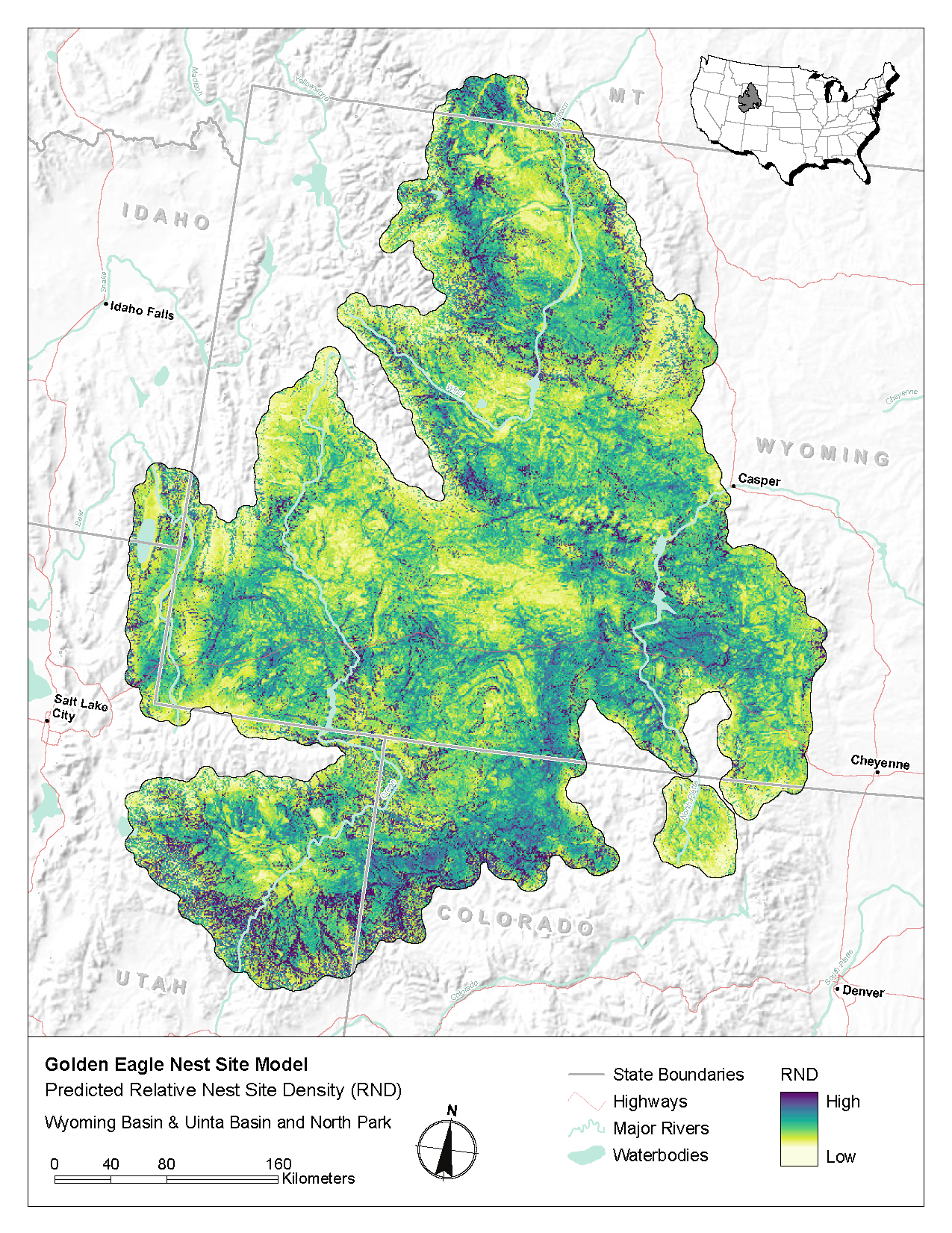 Map of modeled golden eagle relative nest site density in the Wyoming Basin & Uinta Basin and North Park
