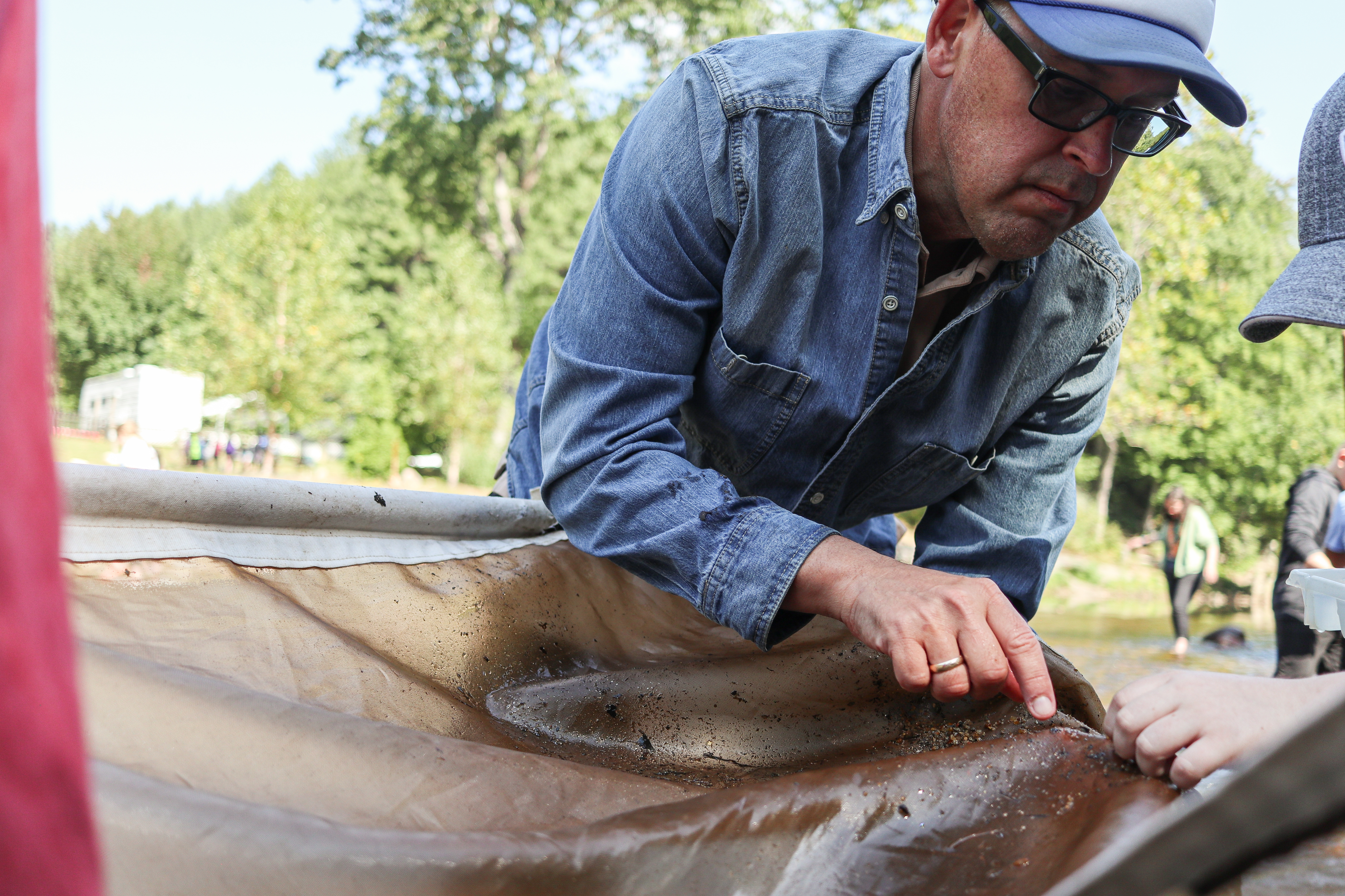 Mark Endries helps Yancey County, N.C. fifth-grade students pull aquatic insects from a kick seine as part of the 2023 Toes in the Toe educational event.