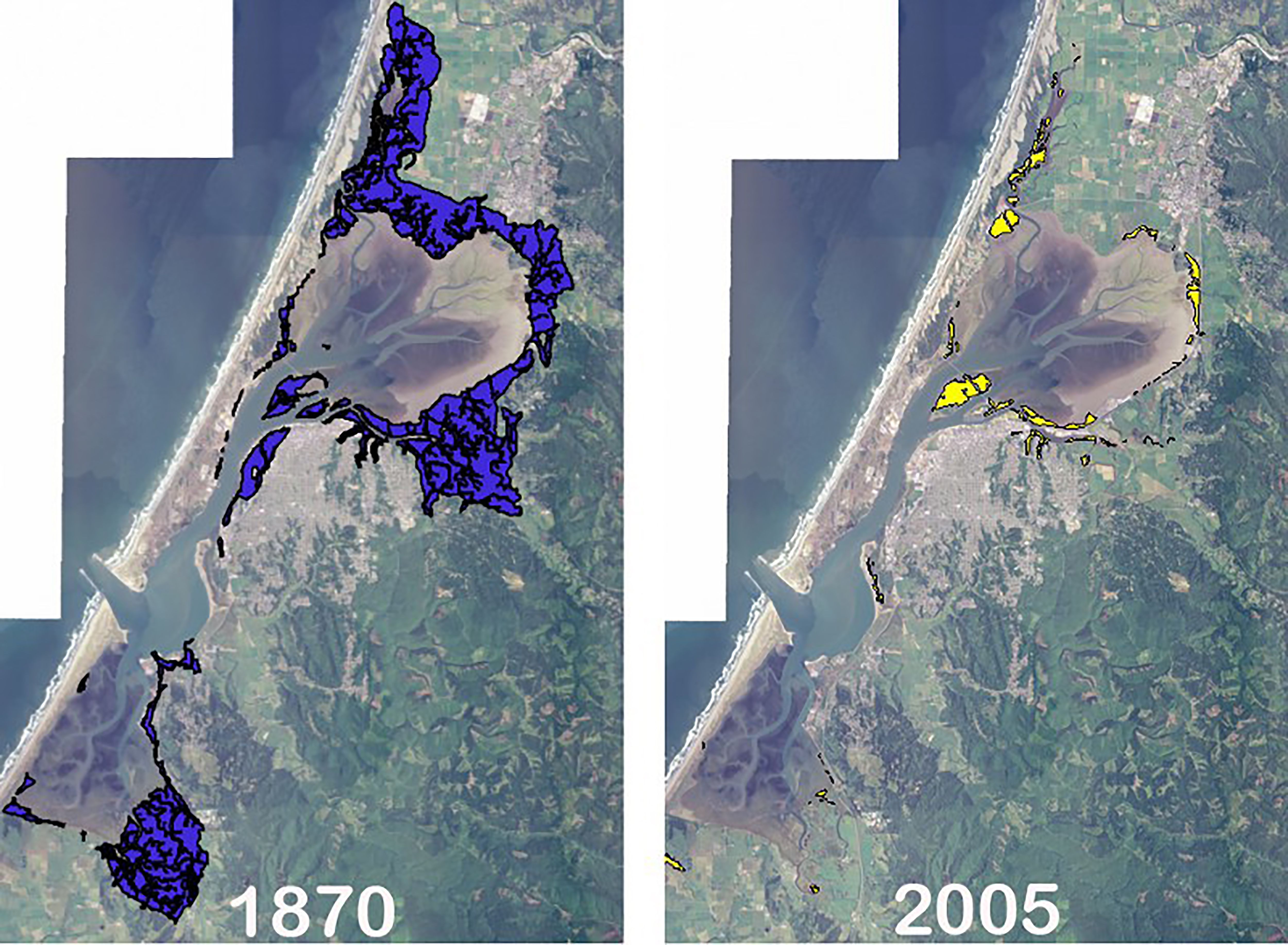 Comparison of salt marsh coverage 1870 to 2005 in Humboldt Bay, California.