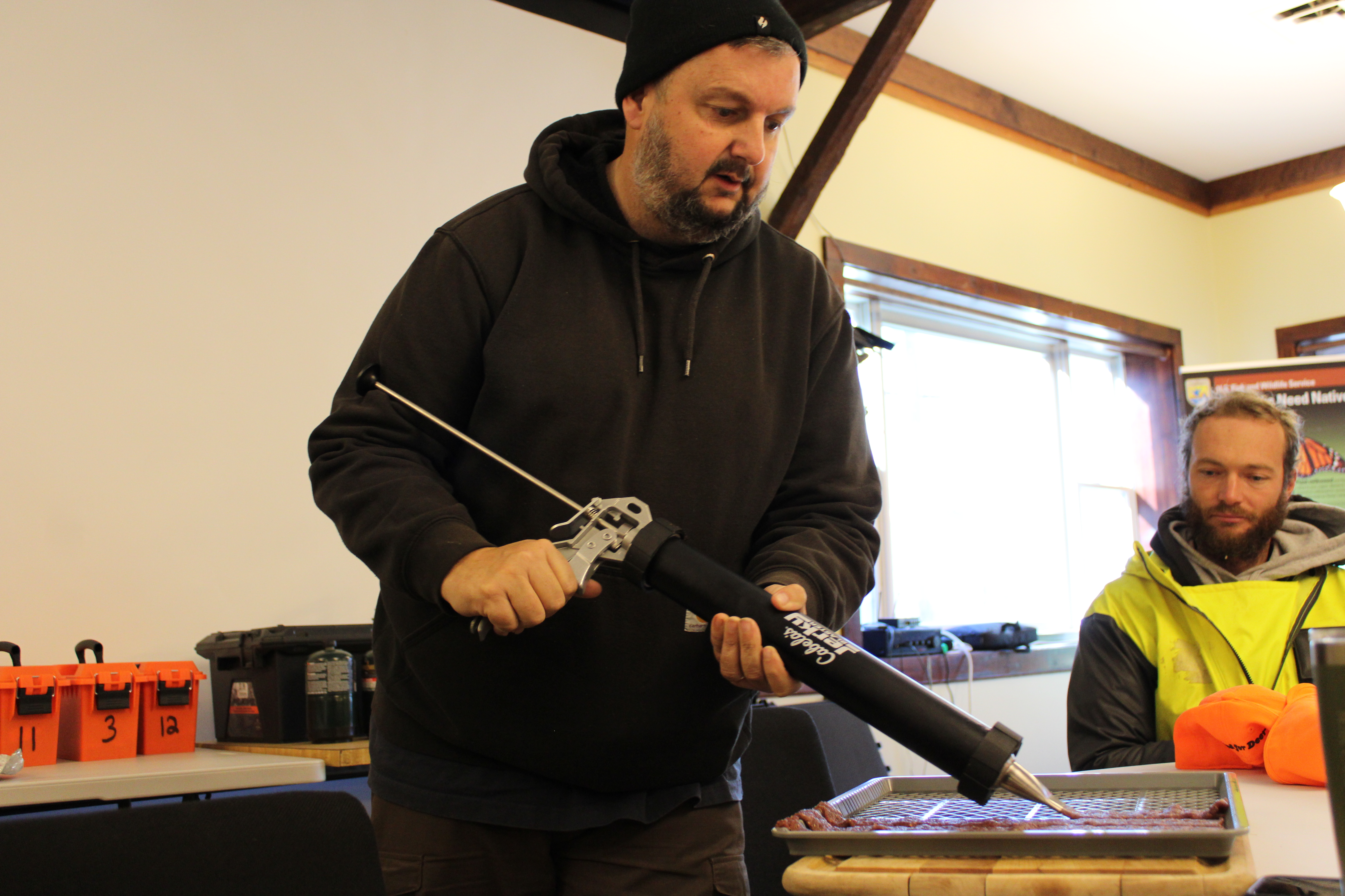 Mentor Mike (L) shows participants how to prepare deer jerky as Mentee Sam (R) watches as part of the Field to Fork mentored rifle deer hunt at Cherry Valley National Wildlife Refuge in December 2024.