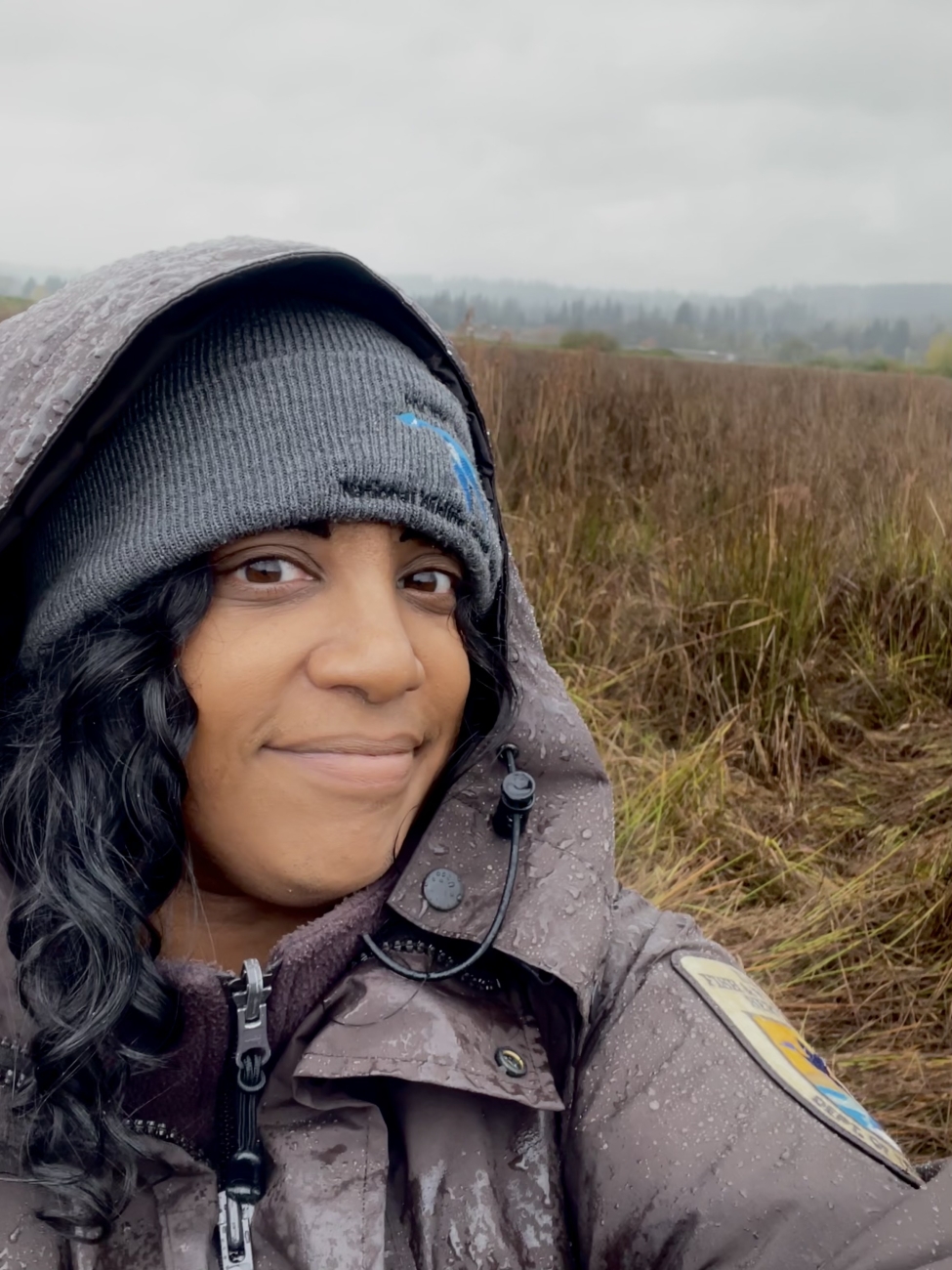 Park Ranger for the Ridgefield NWRC in Washington State stops to pose in the rain.
