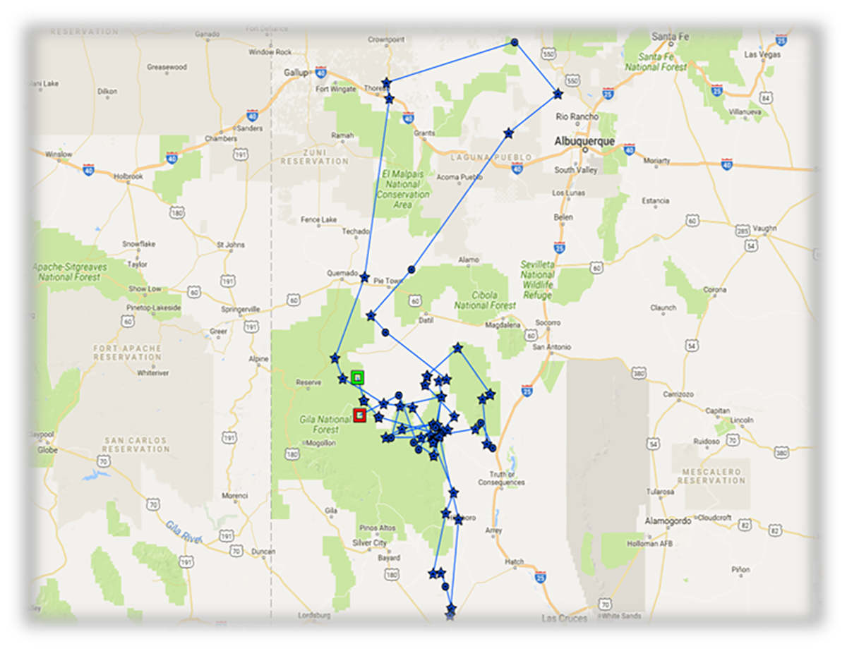 This map shows the path of Mexican wolf 1552 after he dispersed from his pack. After venturing north he returned to his original territory. During a two month period, he traveled at least 775 miles.
