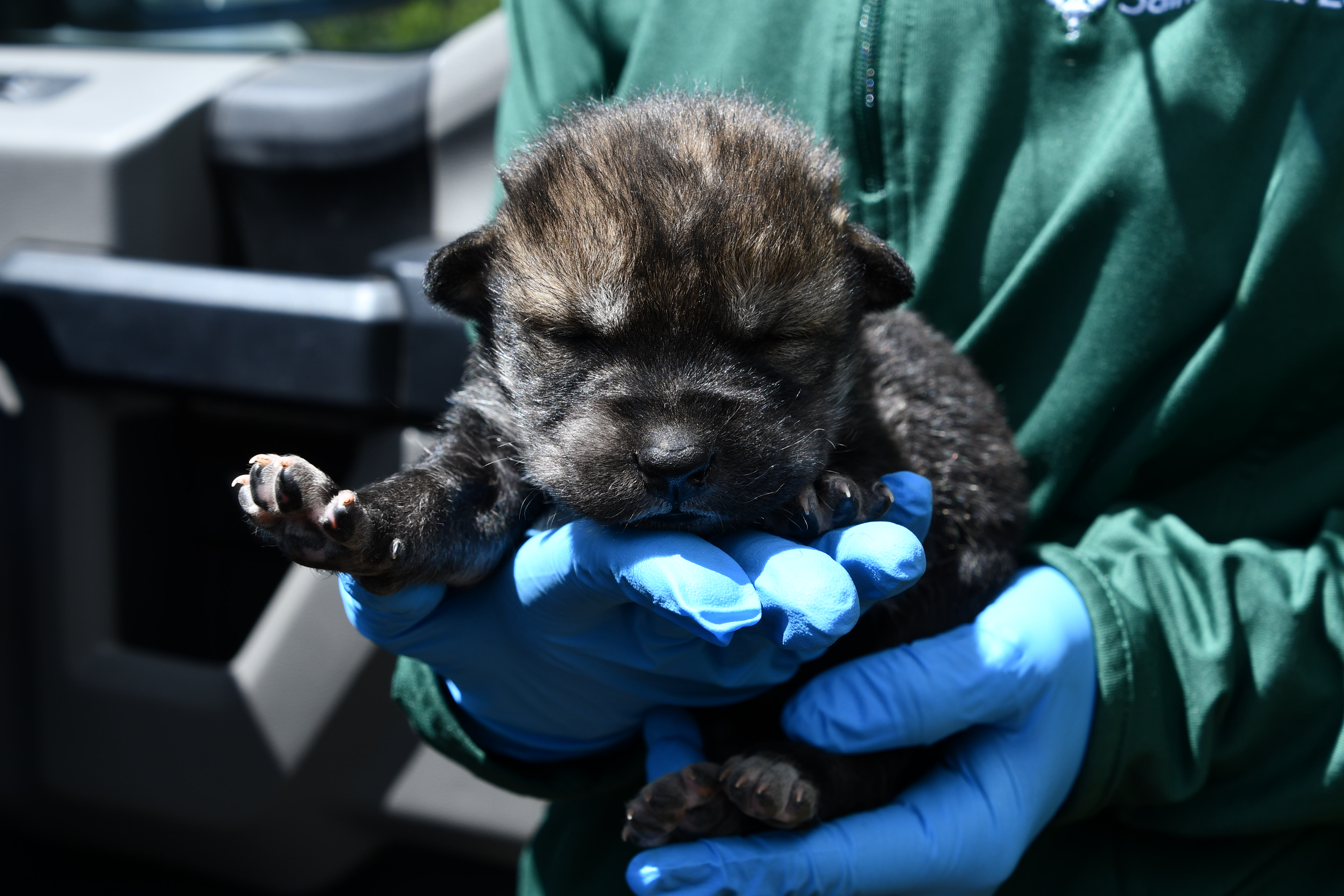 A Mexican wolf pup from captivity is given a health check before being fostered into a wild den as part of 2024 foster operations.