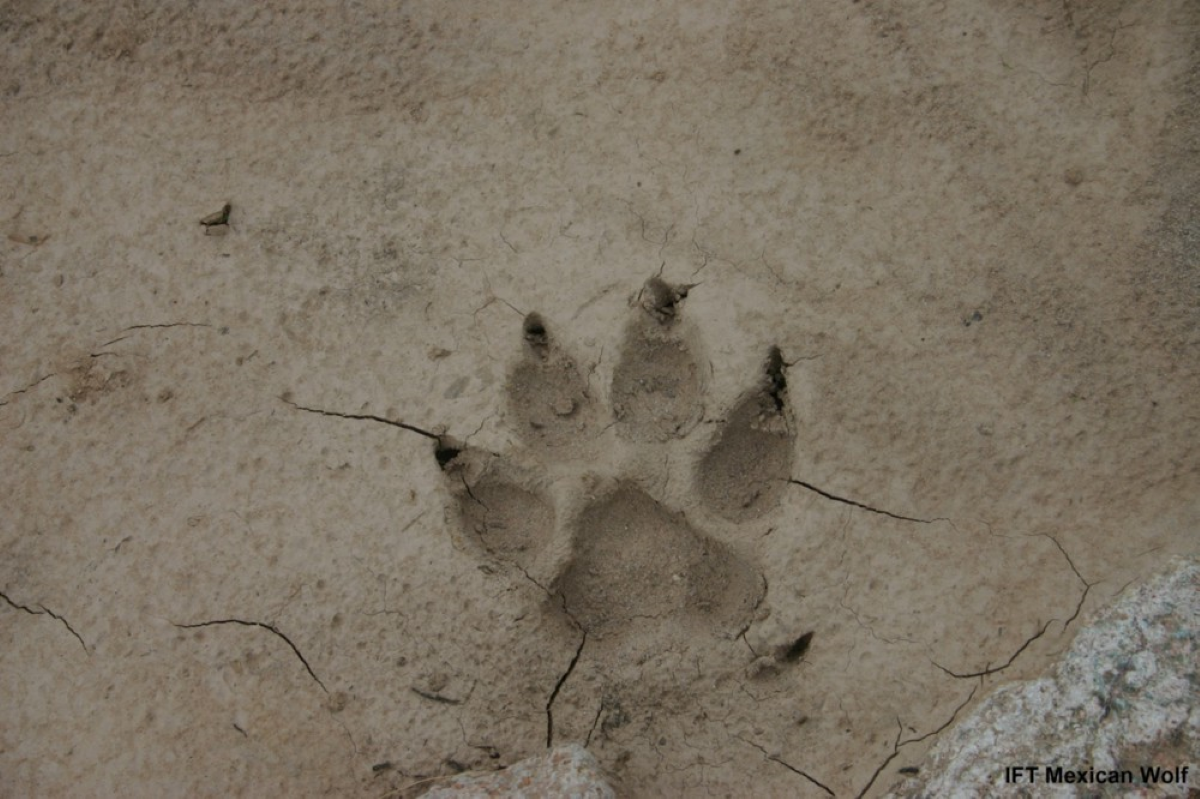 Tracks, like this Mexican wolf paw print, help biologists track wolves during annual ground surveys.