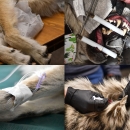 A collage of four images – (clockwise from top left) warm fluids are applied to a sedated Mexican wolf to regulate its body temperature, a spreader is used to expose a wolf's teeth for measurement, an IV line in a wolf's leg is used to administer fluids, and a vaccine is administered to the scruff of a wolf's neck.