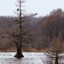 A Bald Eagle perches in a Baldcypress tree in Rockhouse Marsh while ducks swim in the wetland below.