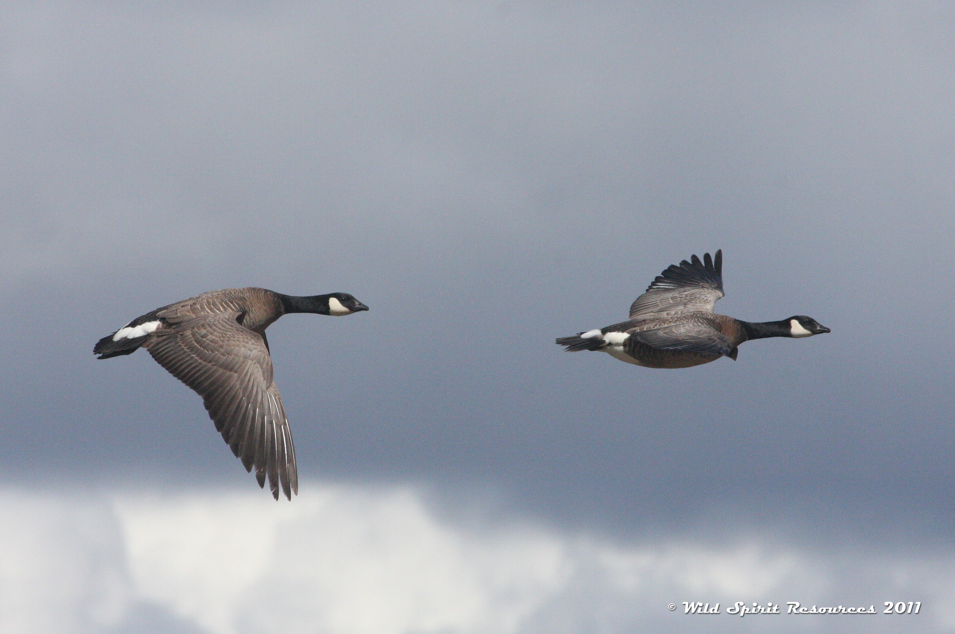 Two Minima cackling geese flying over the Yukon-Kuskokwim Delta, Alaska.