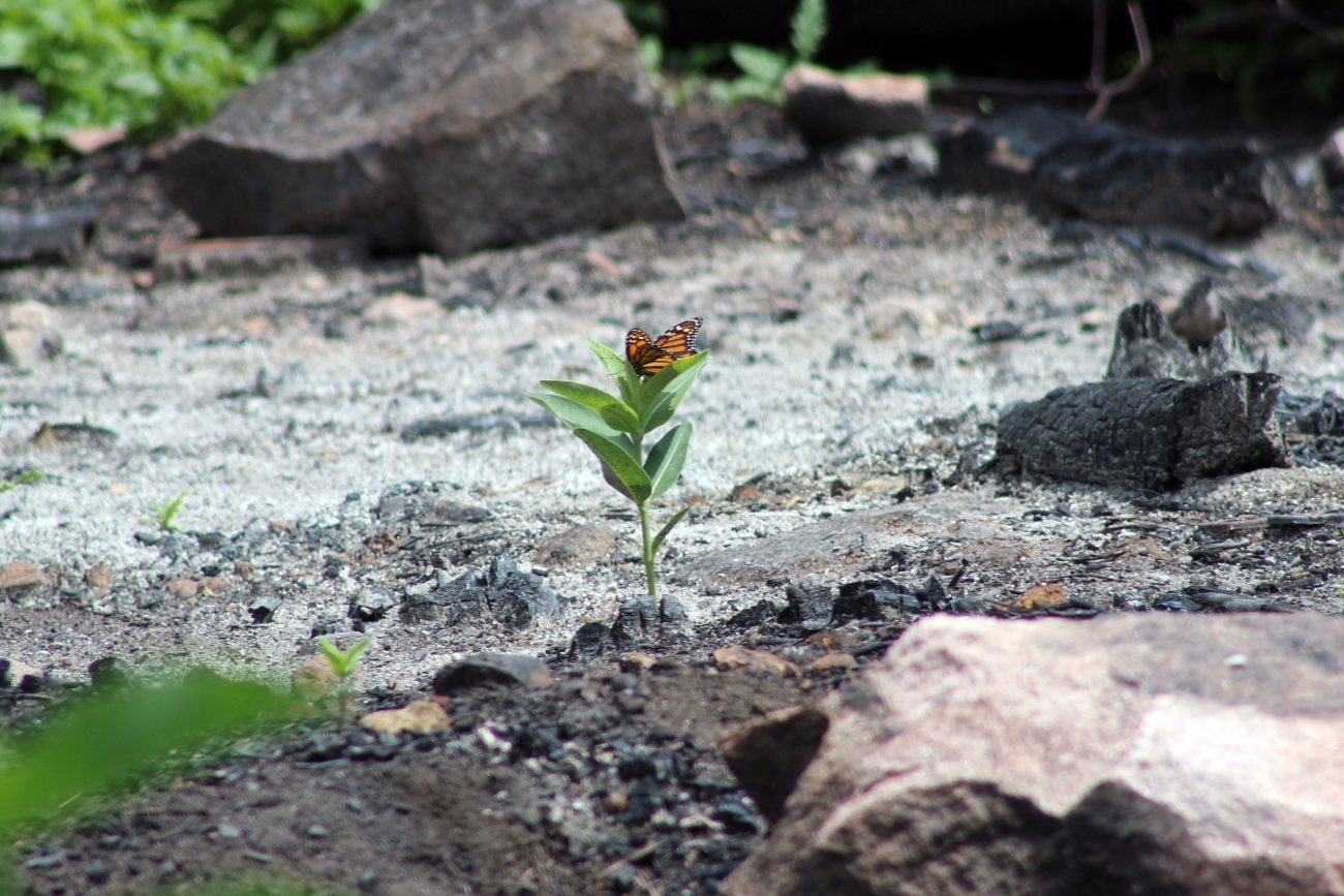 We spotted this monarch butterfly on common milkweed growing in an area that was treated with a prescribed burned. Controlled fire helps remove invasive plants, allowing native plants to flourish.