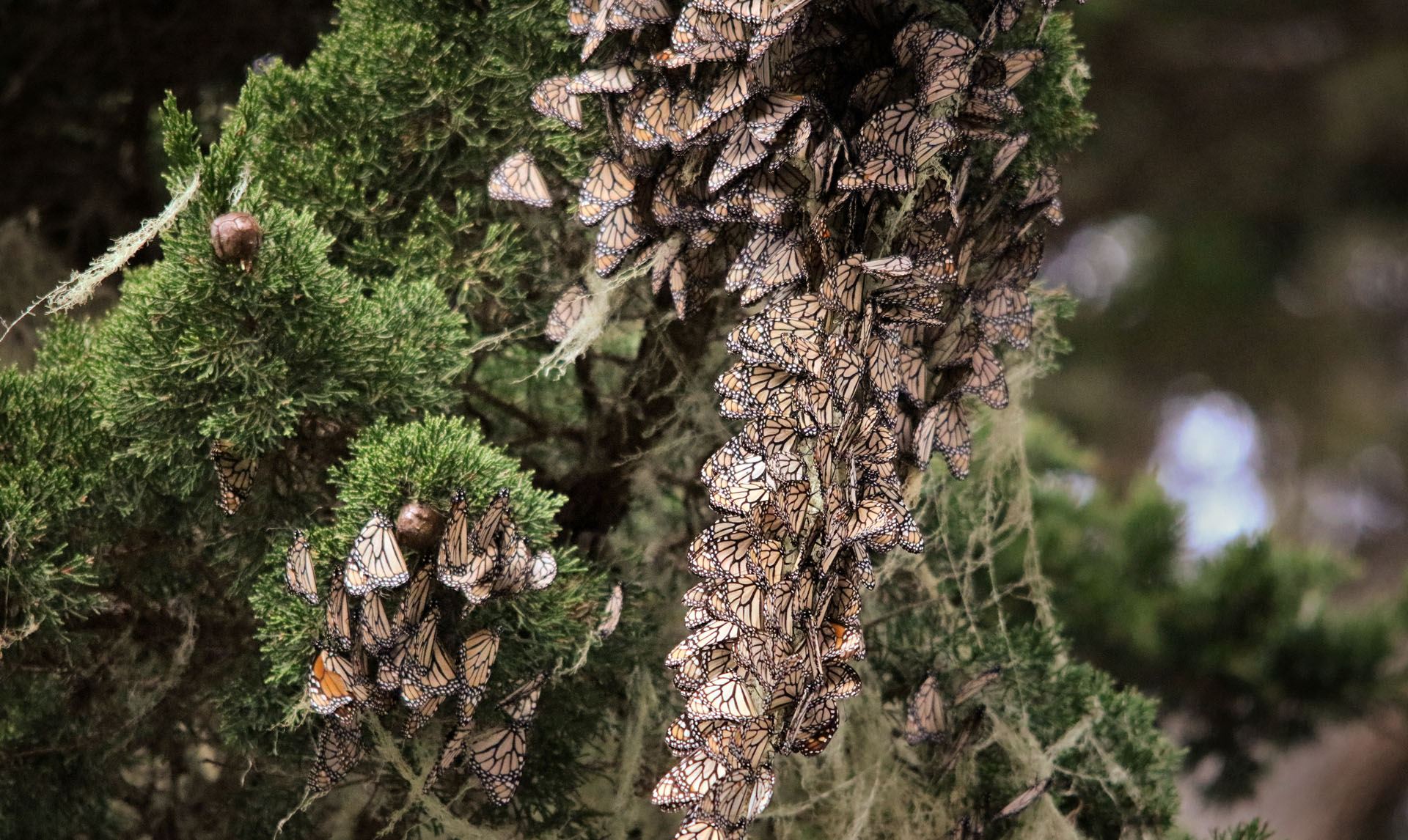 Monarch butterflies on Monterey cypress in Pacific Grove, Calif. Fortunately, monarchs are astoundingly resilient. When clustered, monarchs exhibit their underwings, disguising the butterflies as dead leaves. This provides some protection against predators.